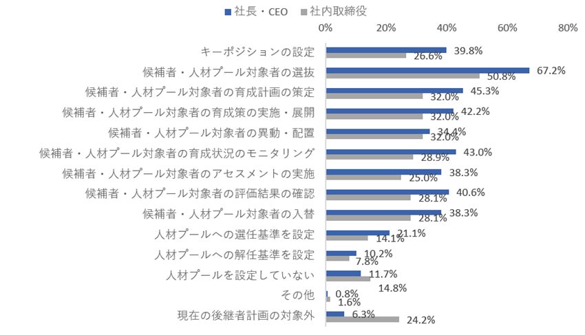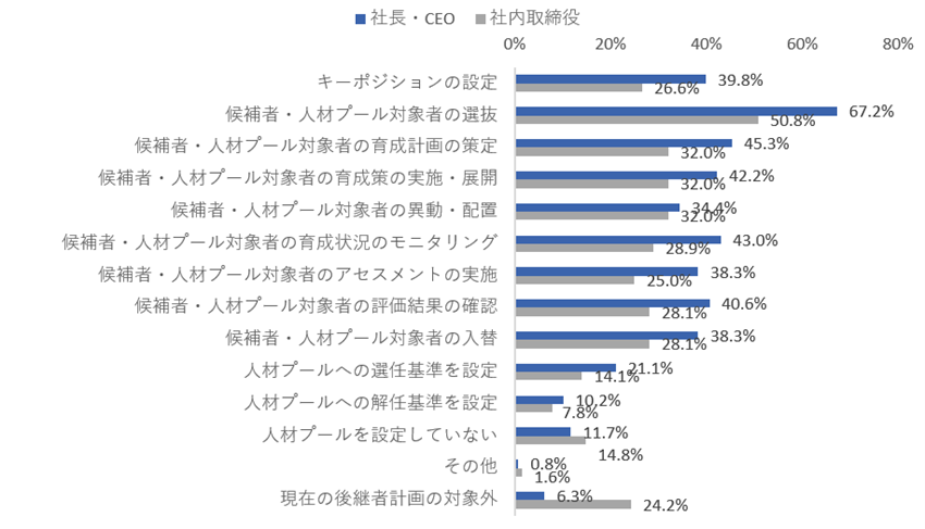 指名委員会の審議事項として「後継者計画」を挙げた企業128社を対象に、その具体的な実施事項を「社長・CEO」、「社内取締役」の対象別に集計しました(図表7)。社長・CEOを対象とした実施事項では、最も多かったのは「候補者・人材プール対象者の選抜」で67.2%と7割弱を占めていました。一方で、人材プールを設定していない企業も11.7%と1割程度みられました。また、社内取締役を対象とした実施事項では、後継者計画について議論していない企業の割合は24.2%でした。また、直近3年間連続して参加している178社について後継者計画のモニタリング状況をみると、52.2%の企業が「取締役会または指名委員会で実施している」と回答し、後継者計画の策定の浸透に伴い、2021年の38.4%、2022年の46.1%から増加傾向にありました。