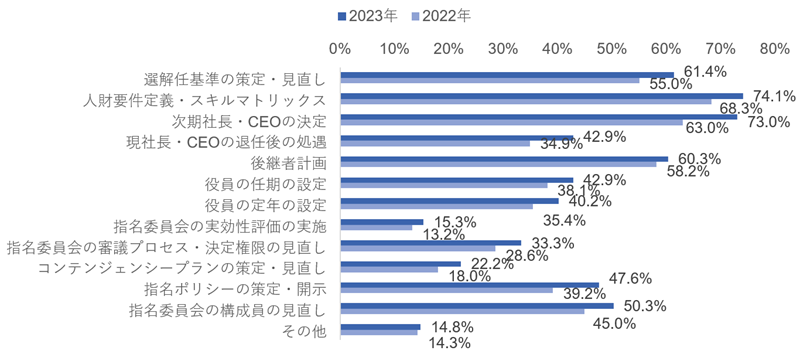 直近3年連続して本サーベイに参加している145社(指名委員会設置済)について、指名委員会の開催回数の平均値は2023年では5.1回であり、2021年の4.8回、2022年の4.0回から増加傾向にありました。また、直近2年間連続して参加している189社(指名委員会設置済)を対象に指名委員会の審議事項を経年比較したところ、昨年に続き「人材要件定義・スキルマトリックス」(74.1%)を挙げる企業の割合が最多でした(図表6)。昨年から比較すると、最も増加幅が大きかったのは「次期社長・CEOの決定」(前年比10.0pt増)であり、次いで「指名ポリシーの策定・開示」(同8.4pt増)、「現社長・CEOの退任後の処遇」(同8.0pt増)でした。
