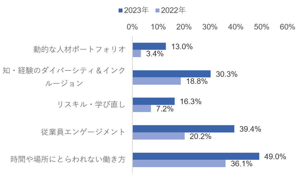 直近2年間連続して本サーベイに参加している企業を対象に、人的資本の開示状況を、先ほどと同様に「3P・5Fモデル」の人材戦略で求められる5つの要素(5F)に合わせて確認すると、全ての項目で昨年から開示が進んでいました(図表9)。最も開示が進んでいたのは「従業員エンゲージメント」であり、19.2pt増加しています。一方で、「動的な人材ポートフォリオ」「リスキル・学び直し」といった項目の開示はそれぞれ13.0%、16.3%でした。