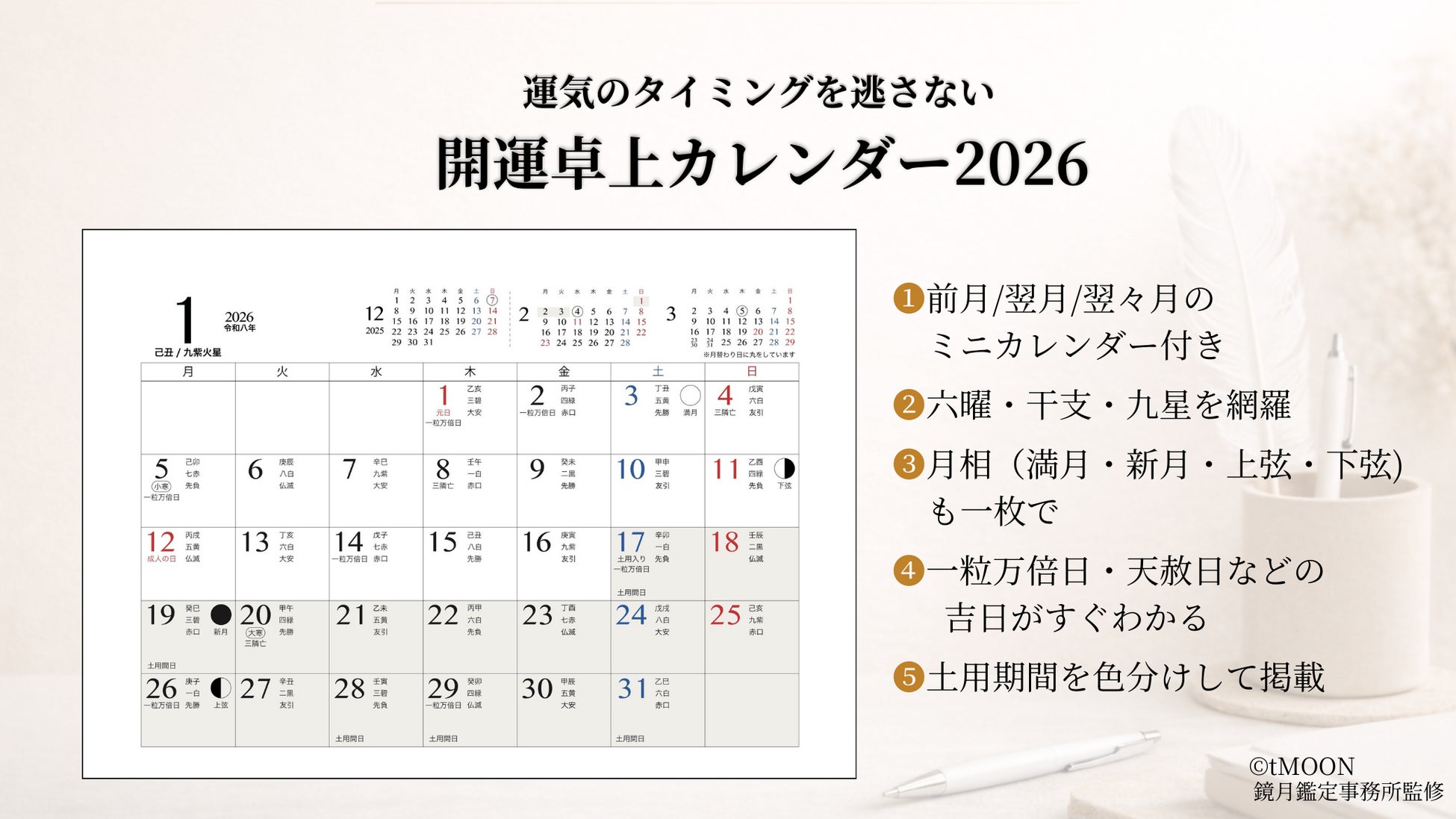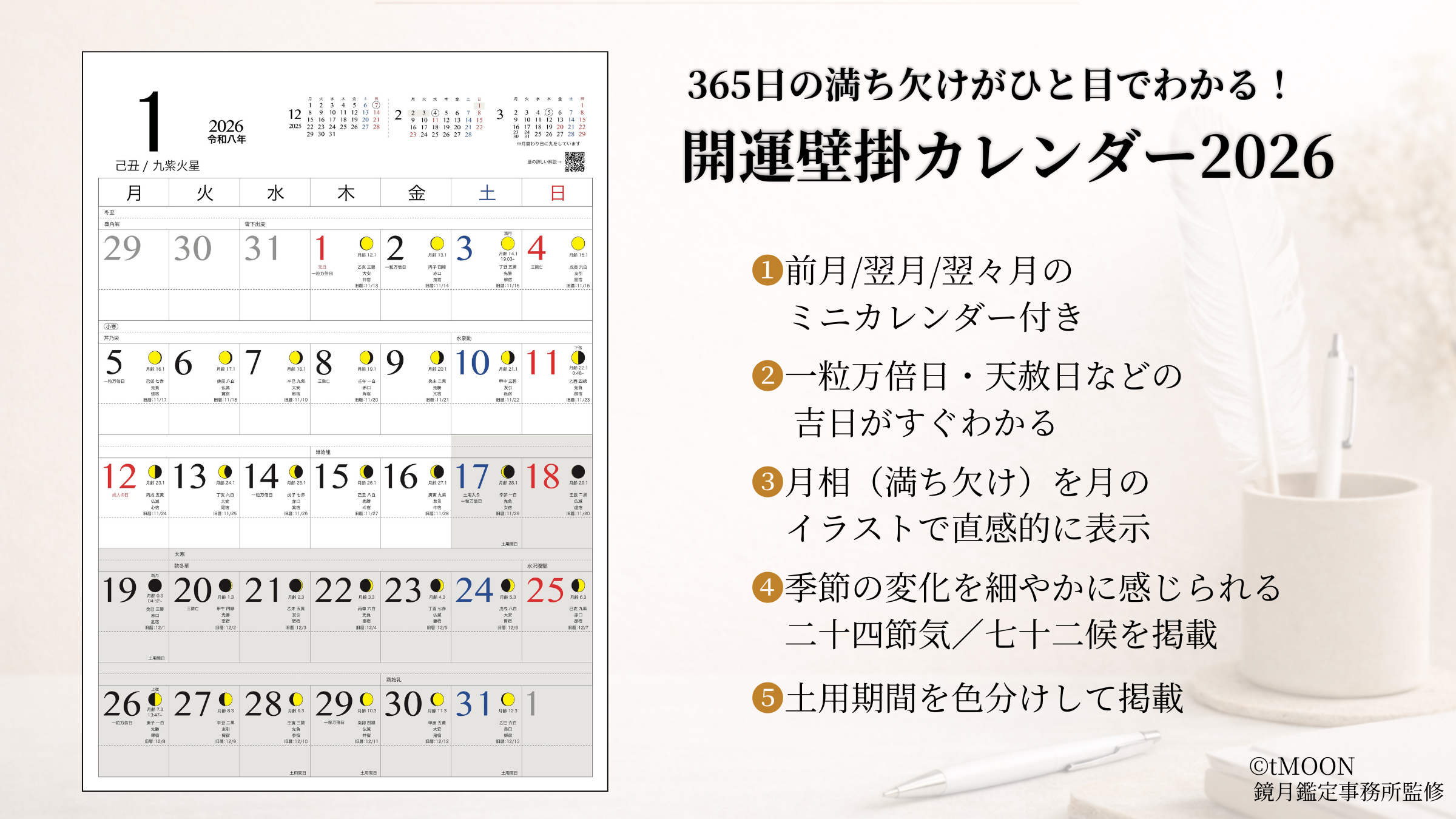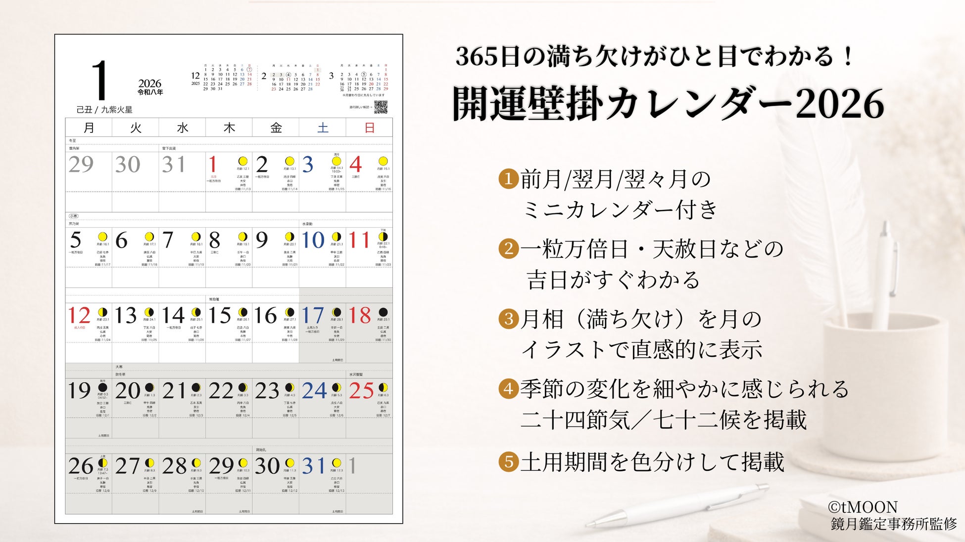 2026年の運気を、美しく整える。『開運カレンダー2026』販売開始!一粒万倍日・天赦日・月の満ち欠けまで網羅した“実力派ミニマルカレンダー”が登場!