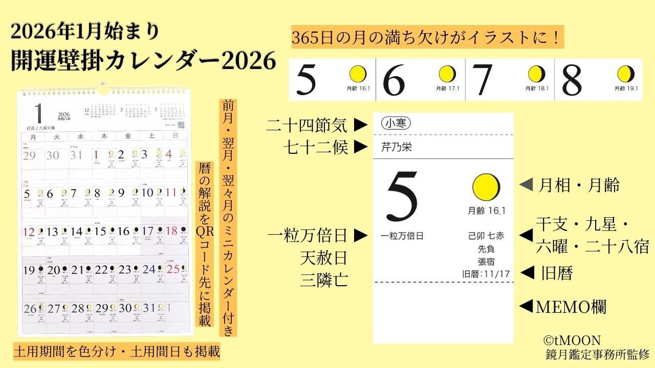 株式会社ビジュアル東京(本社:東京都渋谷区)は、鏡月鑑定事務所監修による運気の流れが一目でわかる『2026年1月始まり 開運カレンダーシリーズ』を12月19日(金)より発売開始いたしました。