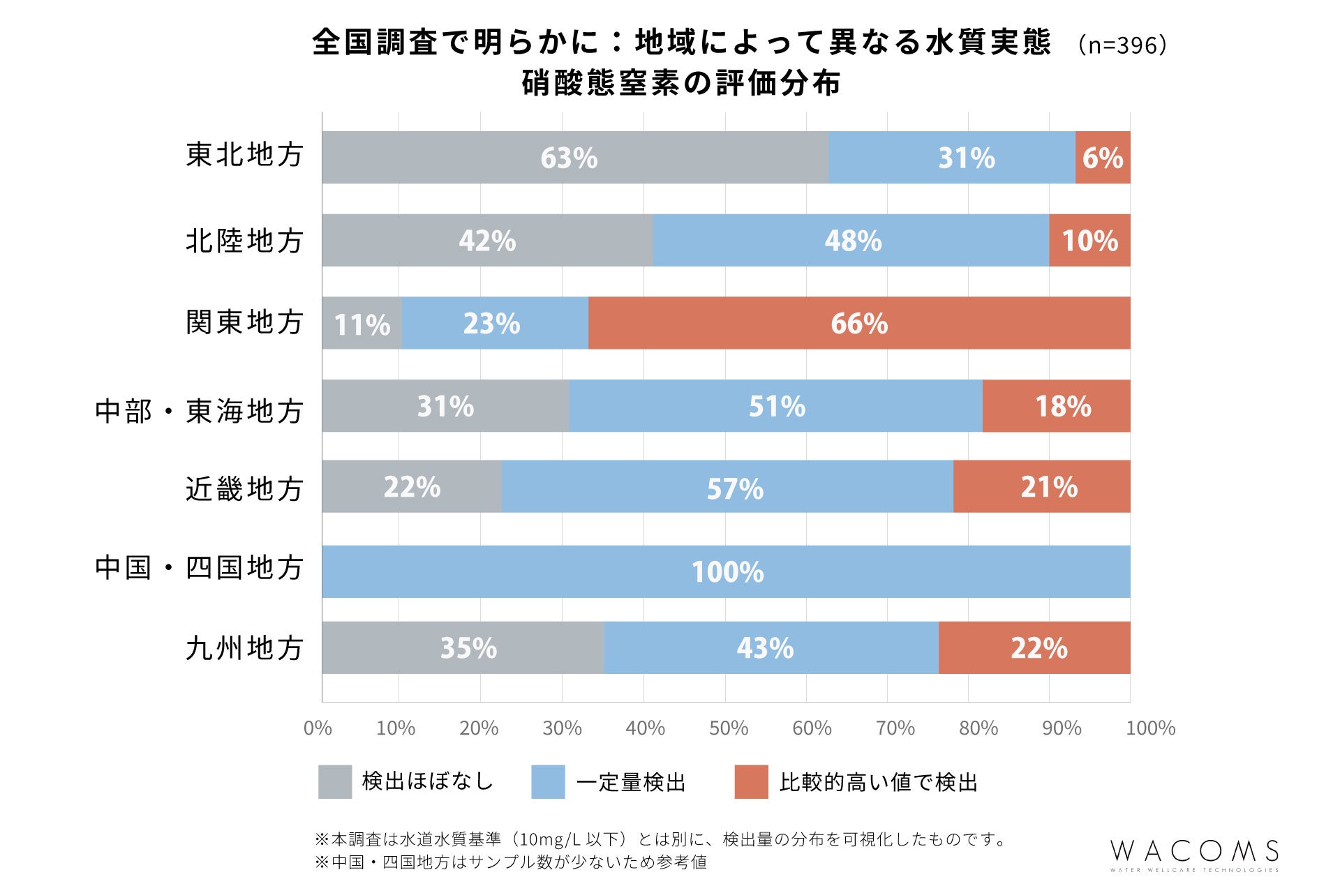 WACOMSでは、全国の家庭を対象に水質検査を実施。その結果、約70%の家庭で硝酸態窒素が検出され、地域によって差があることも確認されました。