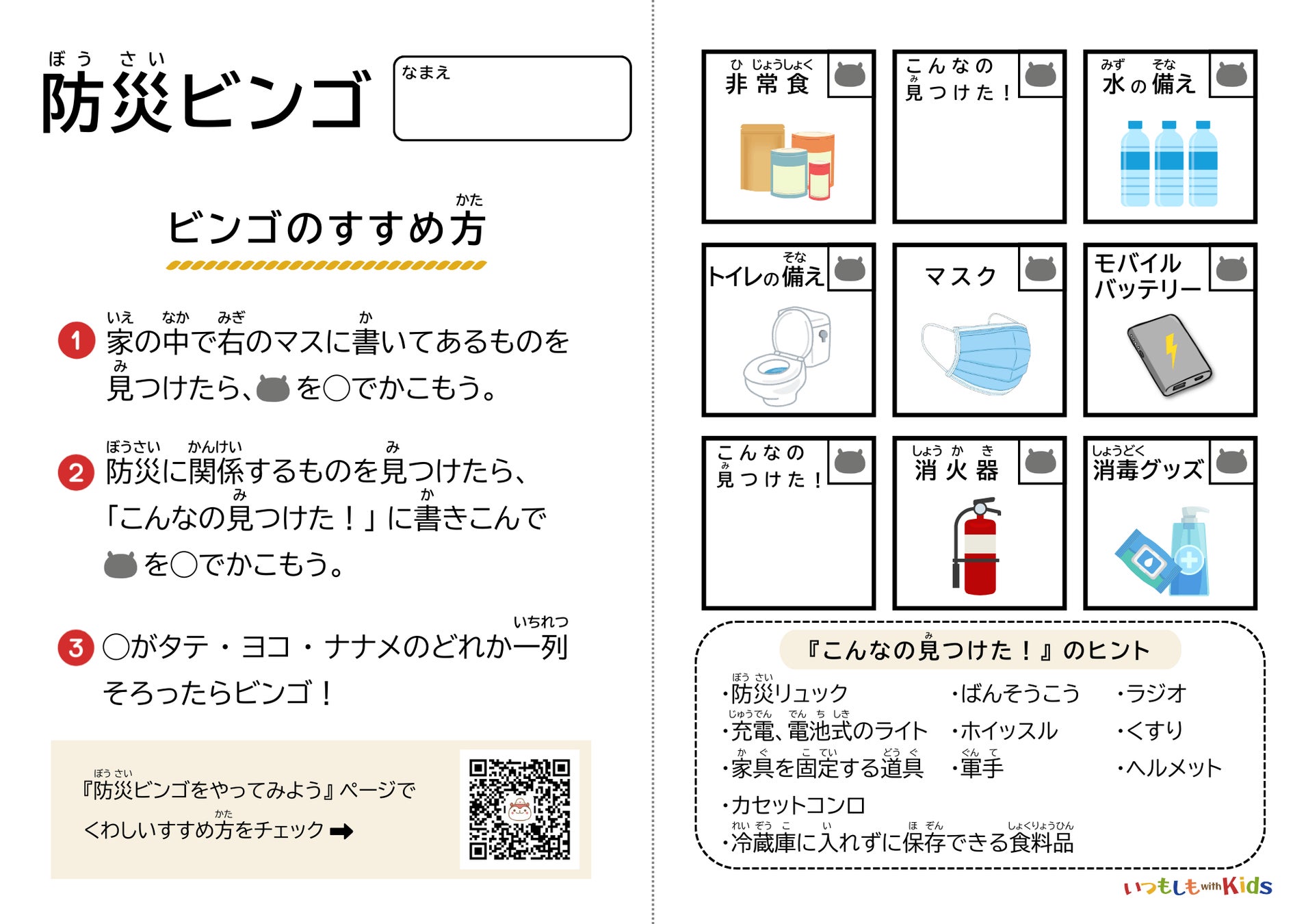 お子さんが災害時に生き抜く力を育むため、『いつもしも』オリジナルの「防災ビンゴ」と「おたすけミニブック」をぜひお役立てください。