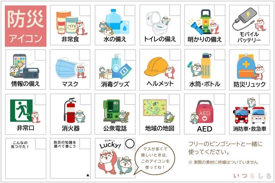 フリーのシートは自由にアレンジできますので、地域の防災イベントでご活用いただく場合は、川の近くなら「水門」、海の近くなら「津波避難タワー」など、その土地特有の防災要素をビンゴに組みこんでいただくのもおすすめです。