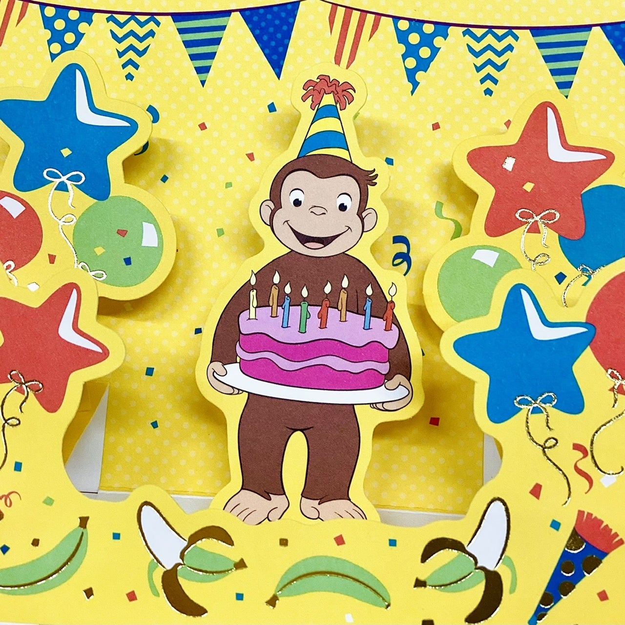カラフルなバルーンやガーランド、ケーキを持ったジョージが描かれたかわいらしい誕生お祝いカードです。