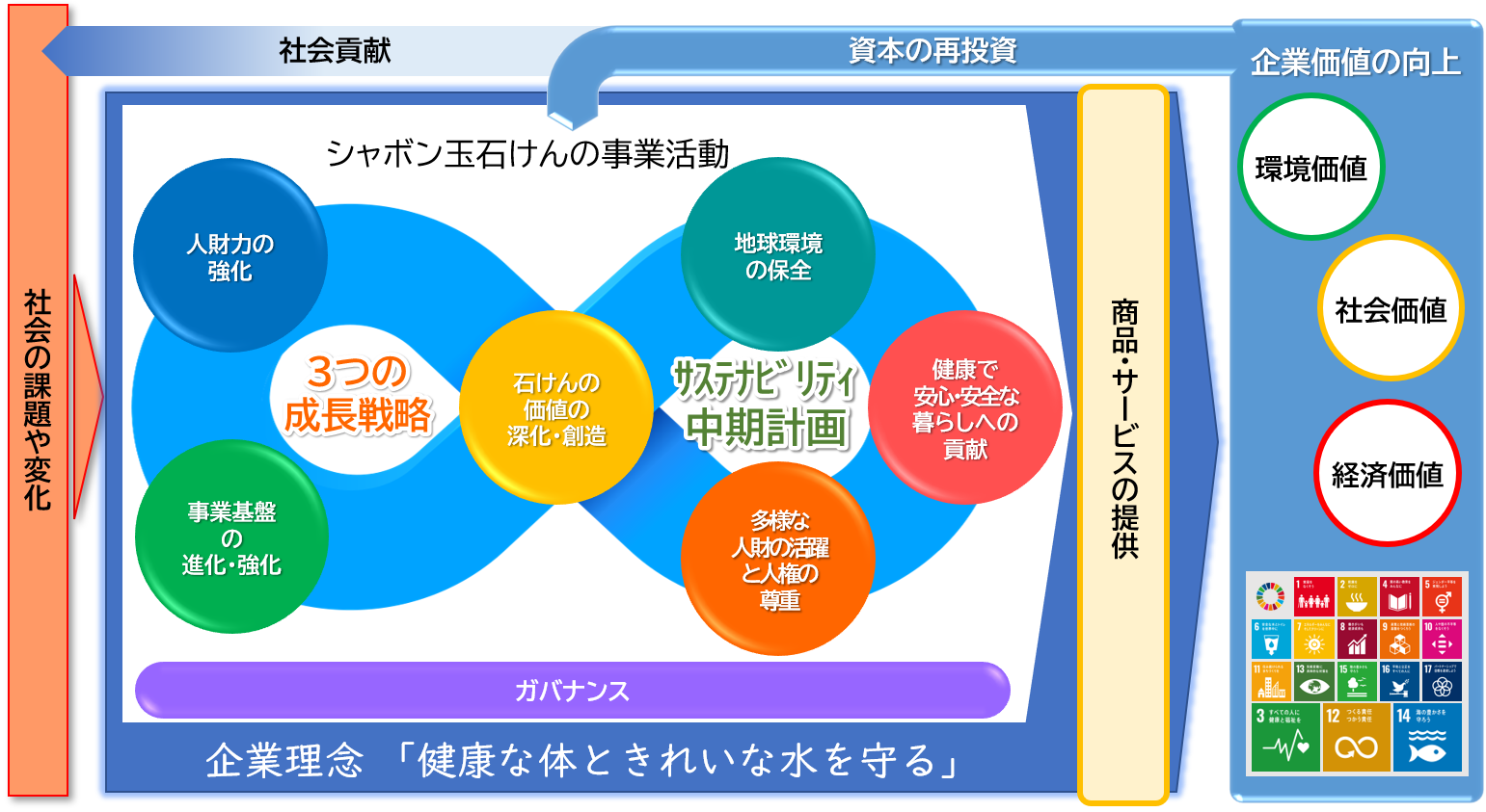 シャボン玉石けんは、「健康な体ときれいな水を守る」という企業理念のもと、1974年より人にも自然にもやさしい無添加石けんの製造・販売に取り組み、いち早く環境問題や人々の健康に向き合ってきました。企業理念を根幹とし、これまでの取り組みに加えて「サステナビリティ中期計画」を推進することで、企業価値を高め、持続可能な社会の実現に貢献できるよう努めてまいります。