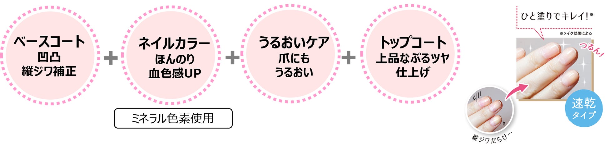 1本で4つの機能(ベースコート、ネイルカラー、うるおいケア、トップコート)を備えたオールインワンネイルとして
