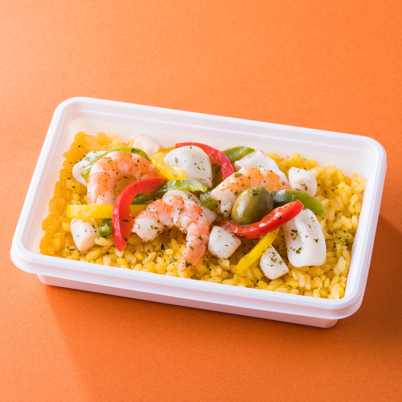 発祥はスペイン東部のバレンシア地方です。世界的に人気のスペイン料理の一つで、機内食風にアレンジした彩り豊かなシーフードパエリアをお楽しみください。