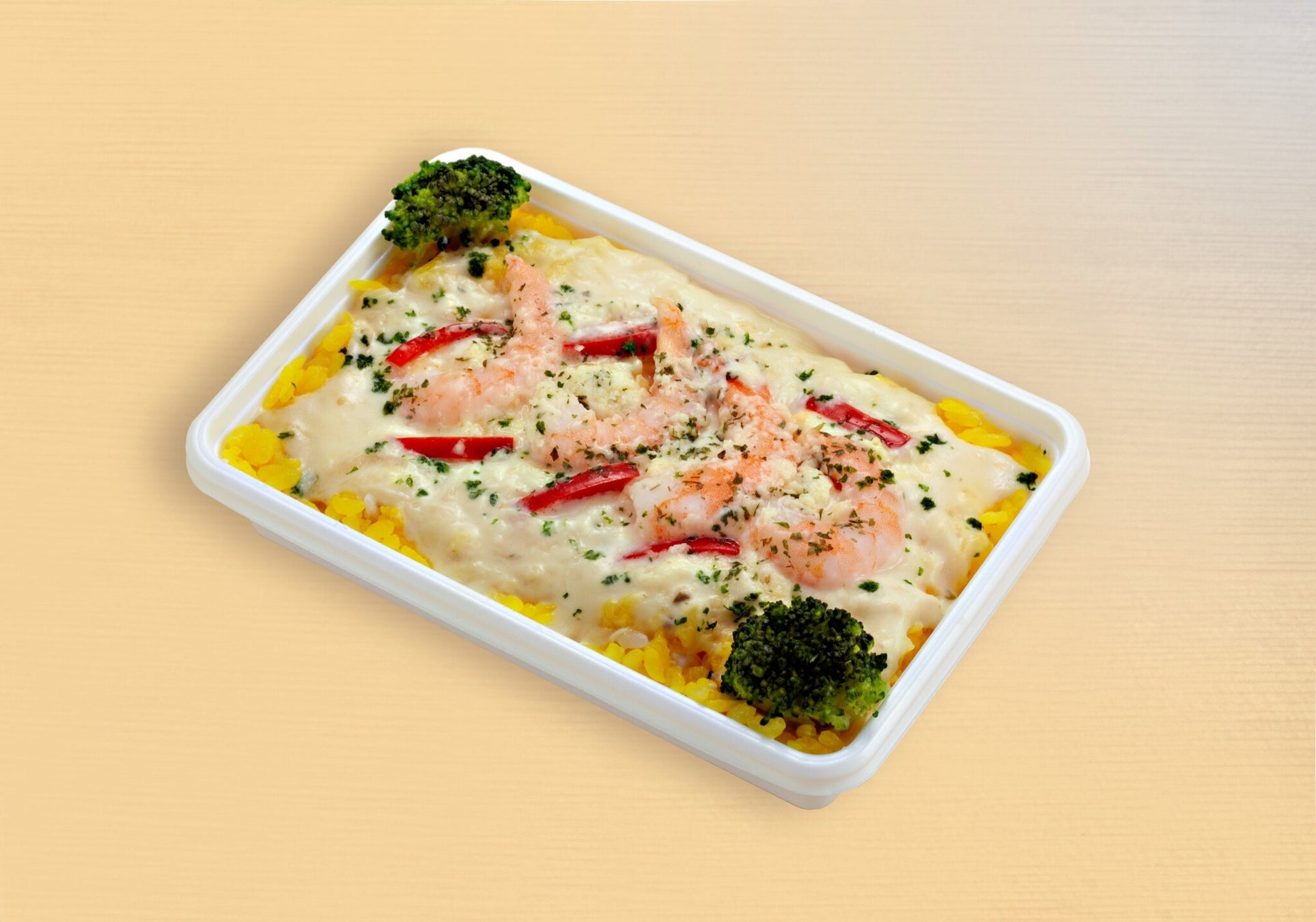 クリームソースをサフランライスにたっぷりかけたドリア風。女性に人気のメニューです。