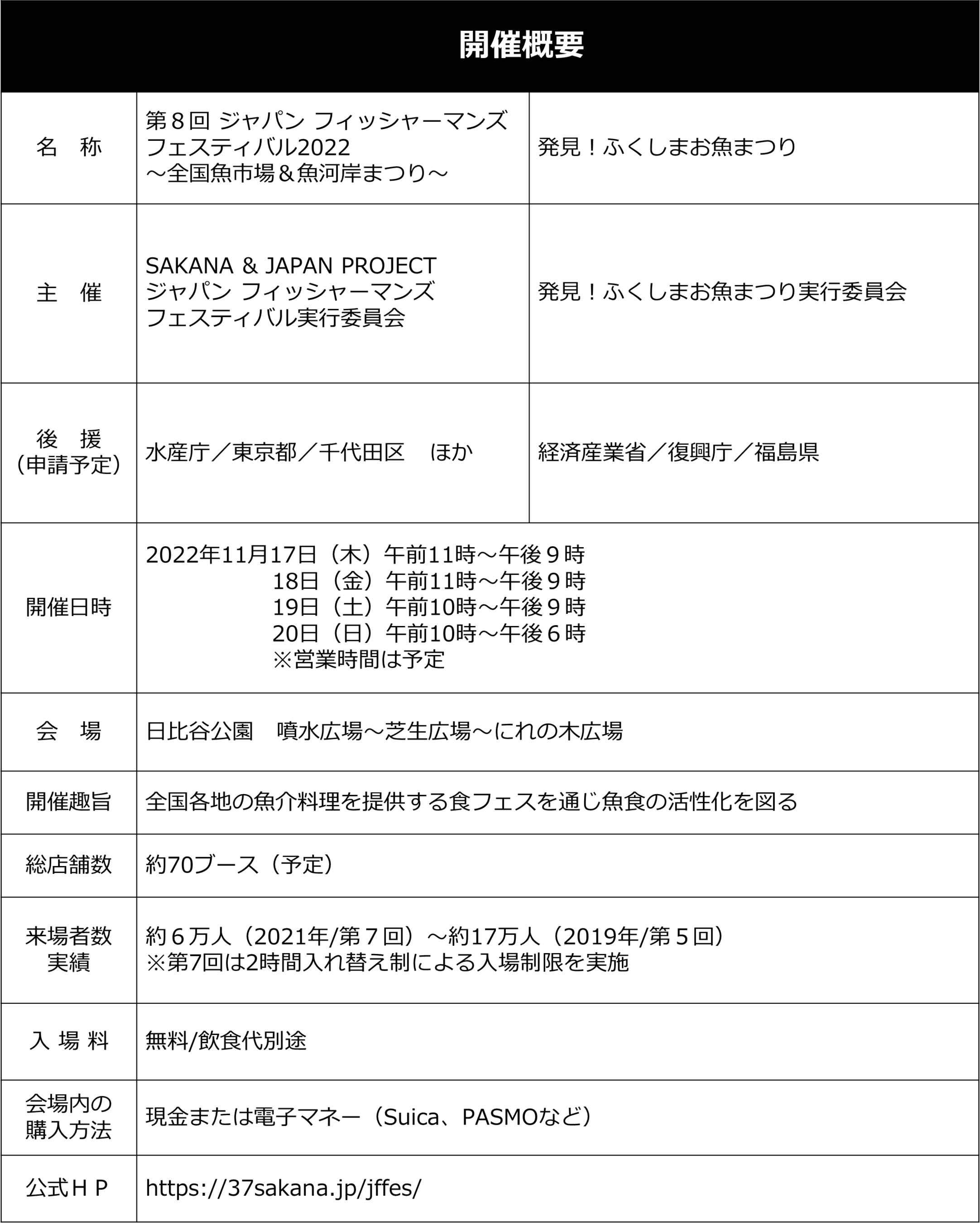 | 名称 | 第8回 ジャパン フィッシャーマンズ フェスティバル2022 ~全国魚市場&魚河岸まつり~ |