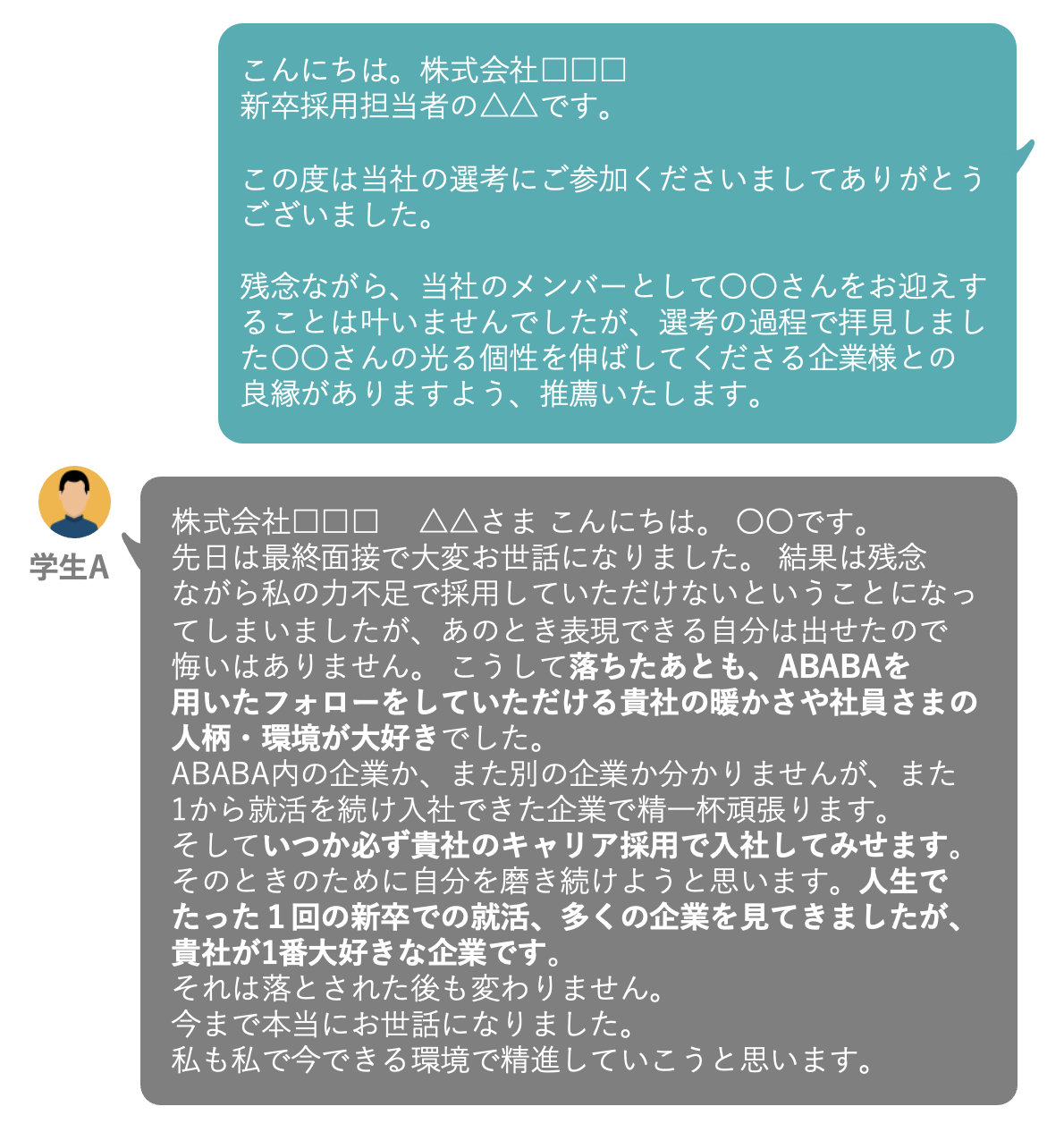 ABABAで、学生が不採用に至るまでに経験した選考過程での頑張りが評価され、次に活かせる就職活動を学生に送ってもらい、社会問題でもある「就活鬱」を払拭できることを望んでいます。