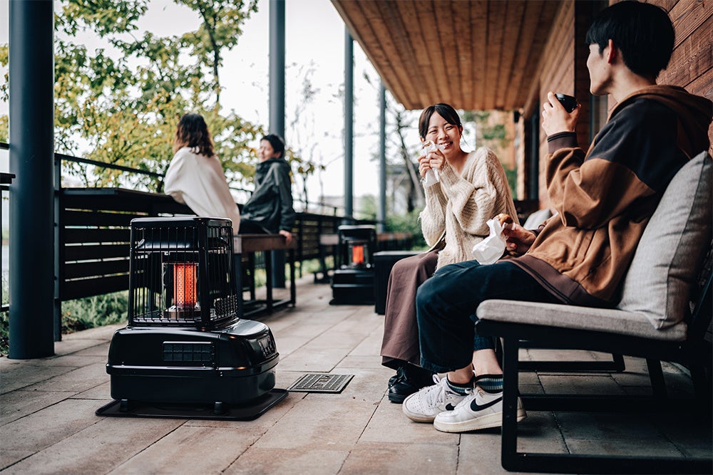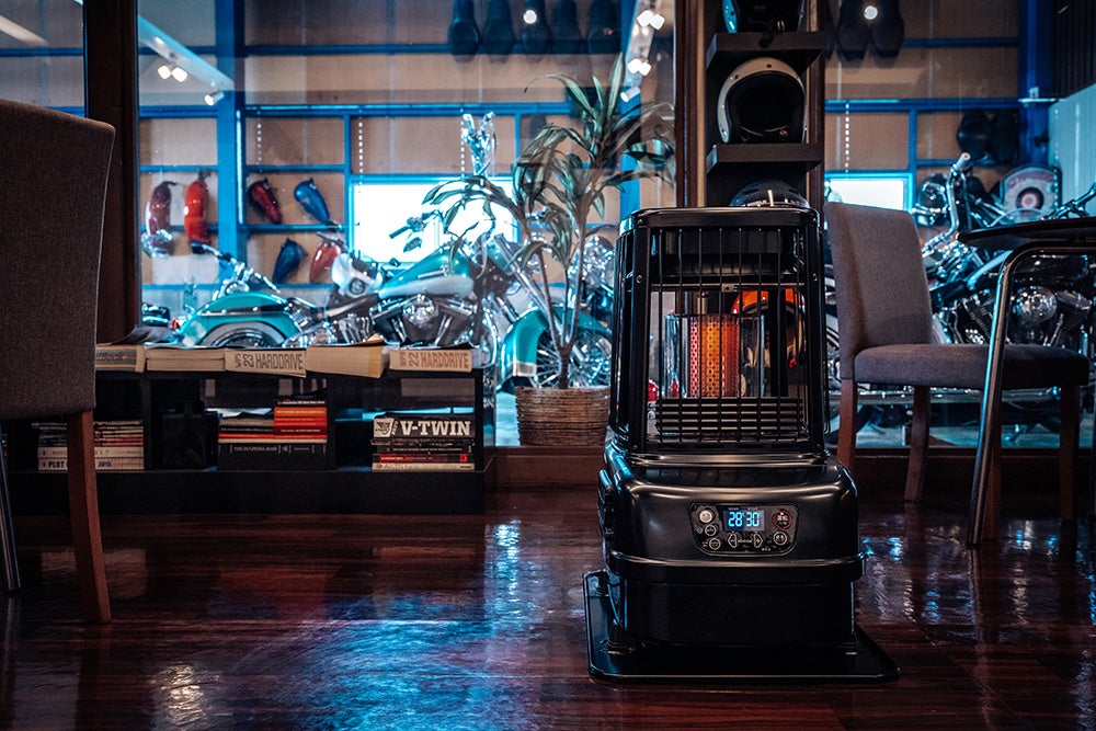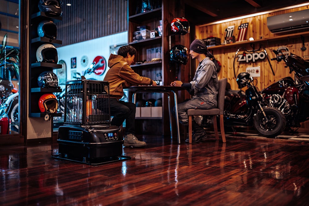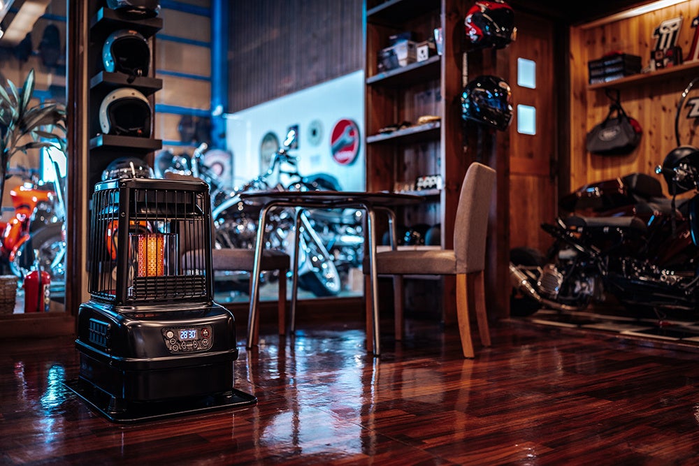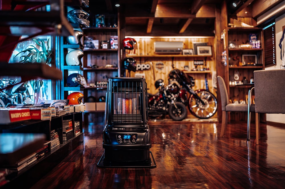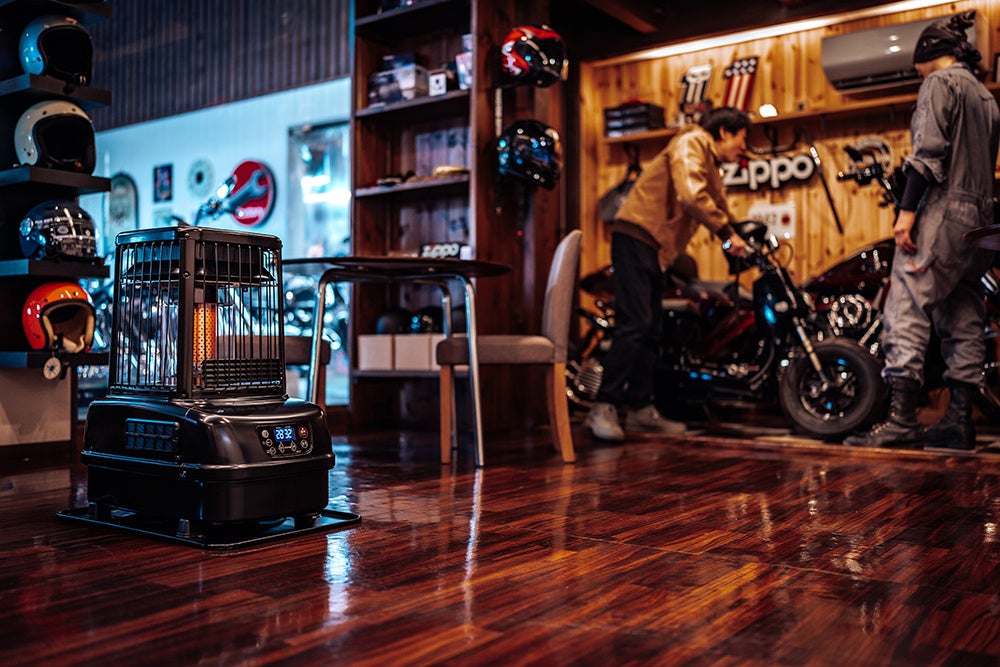 『POWER HEAT』(型式名PH-10) は洗練されたデザインが最大の特徴です。艶めくブラックは高級感がありながらも落ち着きのあるカラー。ガレージやカフェテラスなどの空間にも調和します。