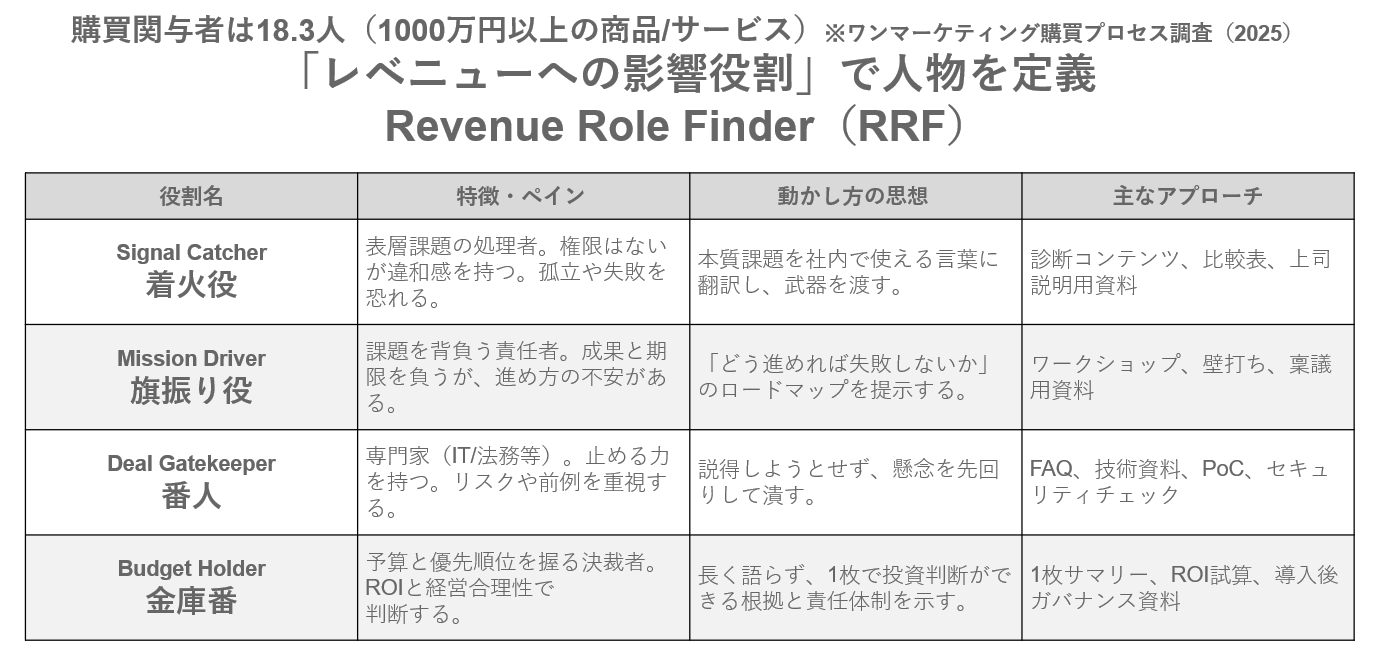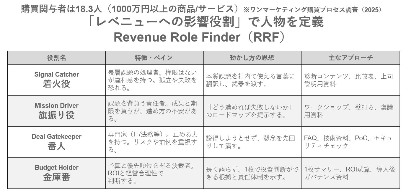 ペルソナ開発が形骸化する根本原因は、「誰に・誰が・何を届けるか」という設計の解像度が不足している点にあります。ワンマーケティングの調査「BtoB購買プロセス白書2025」においても、1,000万円以上の取引では購買関与者が平均18.3名に達することが明らかになっており、単一のペルソナ像だけでは複雑化するグループ購買に対応しきれない実態が浮き彫りとなっています。
