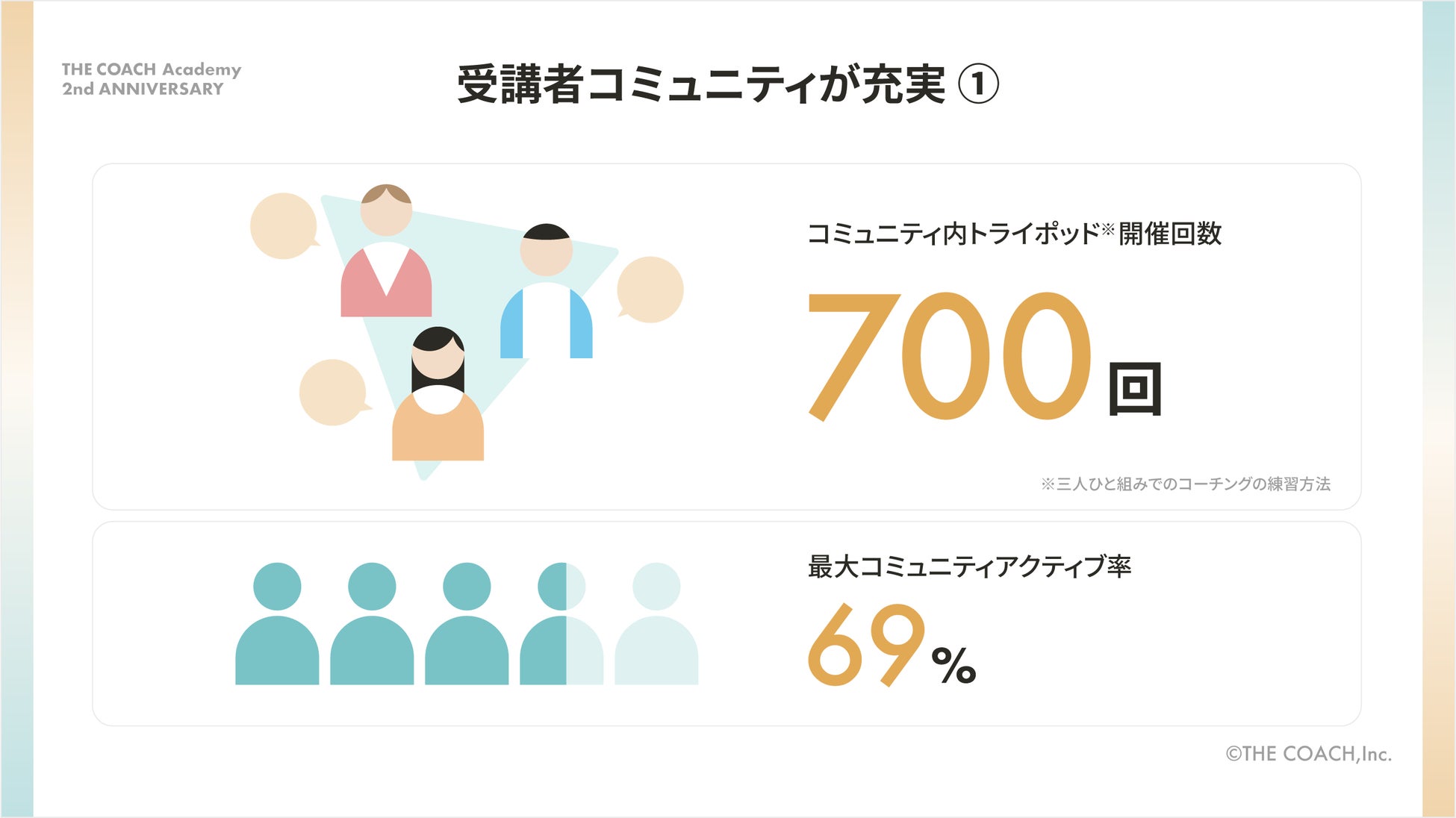コーチングの練習方法である「トライポッド(3人1組でそれぞれがコーチ・クライアント・レビュアーを担当し、コーチングの実践と振り返りを行う)」は、コミュニティ内で700回開催され、受講者による自主的なコーチング学習を促進。また、コミュニティ内の交流も盛んで、コミュニティアクティブ率(期間内にSlackコミュニティにログインしたユーザーの割合)は69%以上と高い水準を記録しています。