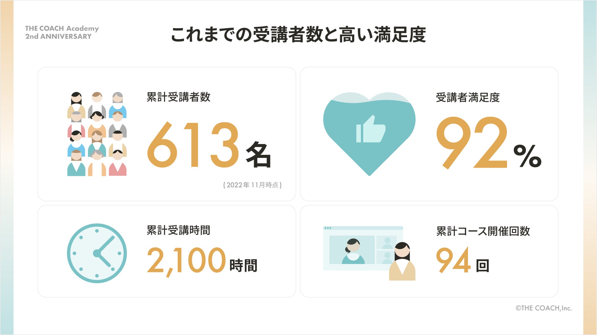 株式会社THE COACH(本社:東京都渋谷区)が運営するオンラインコーチングスクール「THE COACH Academy」は、2022年11月2日にサービスリリースから2周年を迎えました。