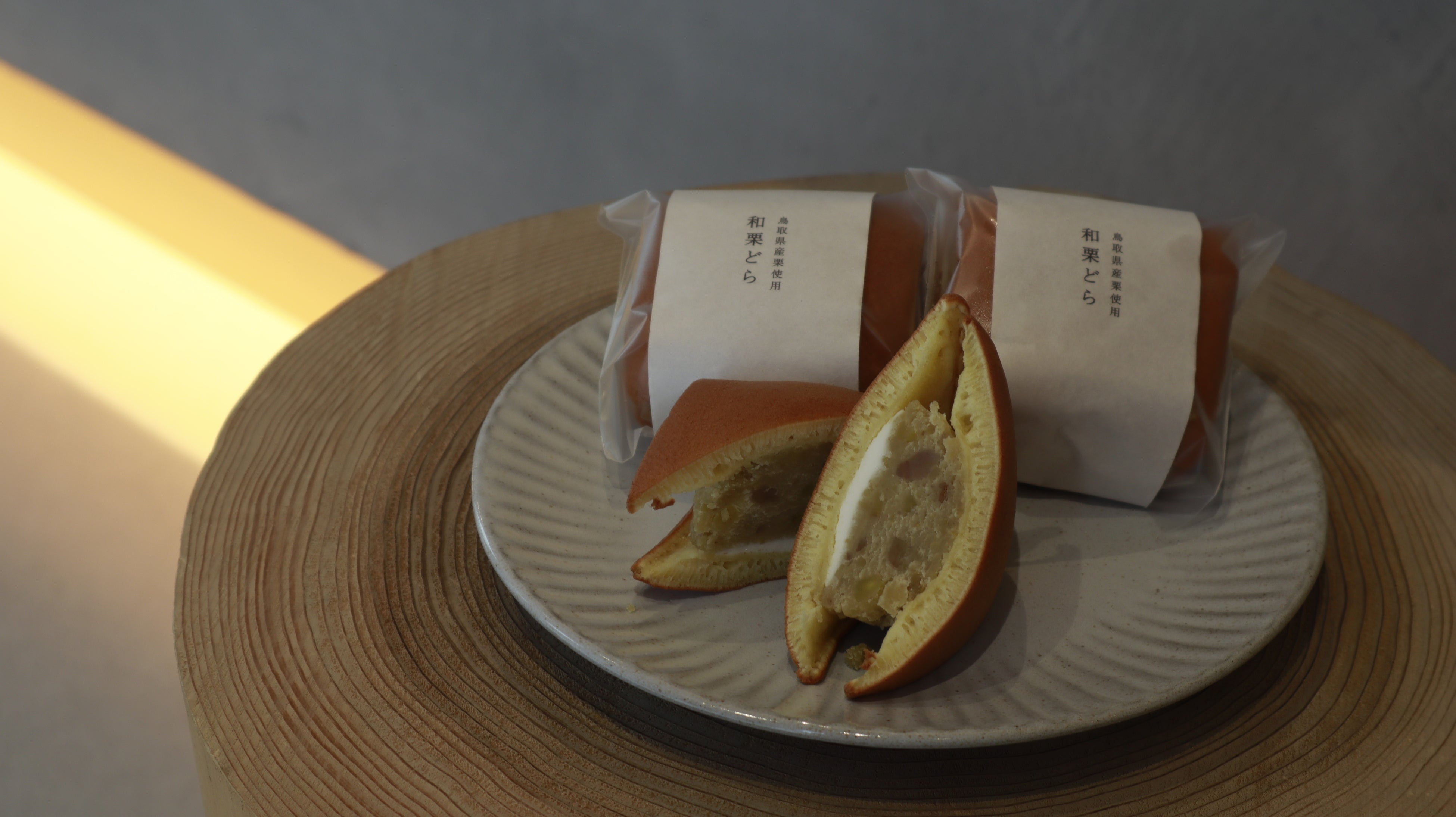 当店の「クリームチーズ和栗どら焼き」には、どら焼きの餡に鳥取県米子市にある農家さんの和栗を使用しています。その和栗を甘露煮から手作りし、自家製和栗ペーストにしました。自家製和栗ペーストには鳥取県大山町産のバターを使用し、生クリームと一緒に練ることで洋風ペーストに仕立てています。また、お店から徒歩3分以内にある皆生海岸の海水を自ら汲み上げ直火で炊いた、自家製塩を少量加えることで、和栗のやさしい甘さを引き立てます。こちらの洋風に仕立てた和栗ペーストは、鳥取県大山町産のクリームチーズとの相性が抜群です。甘さと塩味、酸味のバランスを工夫した、まるでモンブランを食べているかのような和スイーツになっています。