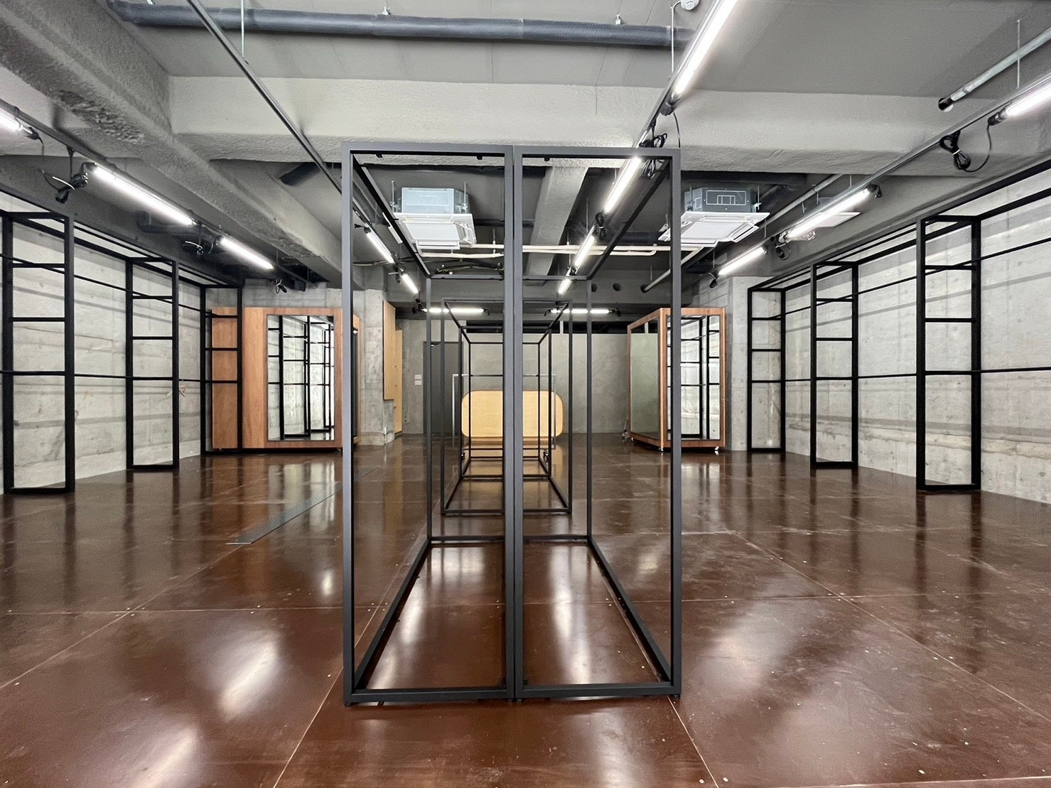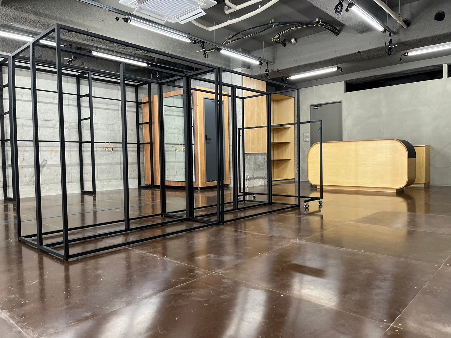 京都らしく"和"の趣きを取り入れた入口を抜けると、"倉庫"をイメージした店内は、1990年代のストリートカルチャーの空気感を取り入れ、スケボーパークをイメージさせる床や、"黒"と"鉄"を基調としたモダンでインダストリアルな什器など、異なるスタイルを組み合わせる事で生まれた新しい空間でNANGAのプロダクツを感じていただきたいと思います。