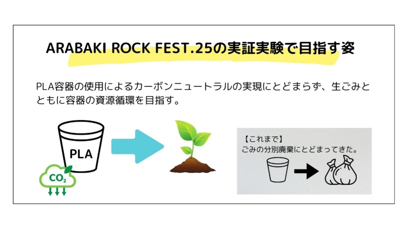 ARABAKI ROCK FEST.25では、上述のとおりPLA容器を飲食ブースにて幅広く使用します。このPLA容器は、株式会社高速とリスパック株式会社から提供されます。PLA容器は植物原料から作られているため、①石油資源の節約、②原料となる植物は短期間で再生可能、③大気中のCO2を増やさない(カーボンニュートラル)という特徴が挙げられます。今回の実証実験では、PLA容器の堆肥中での生分解を目指しますが、PLAのカーボンニュートラルという特徴により、イベント期間のCO2増加を抑制するという効果を実現します。