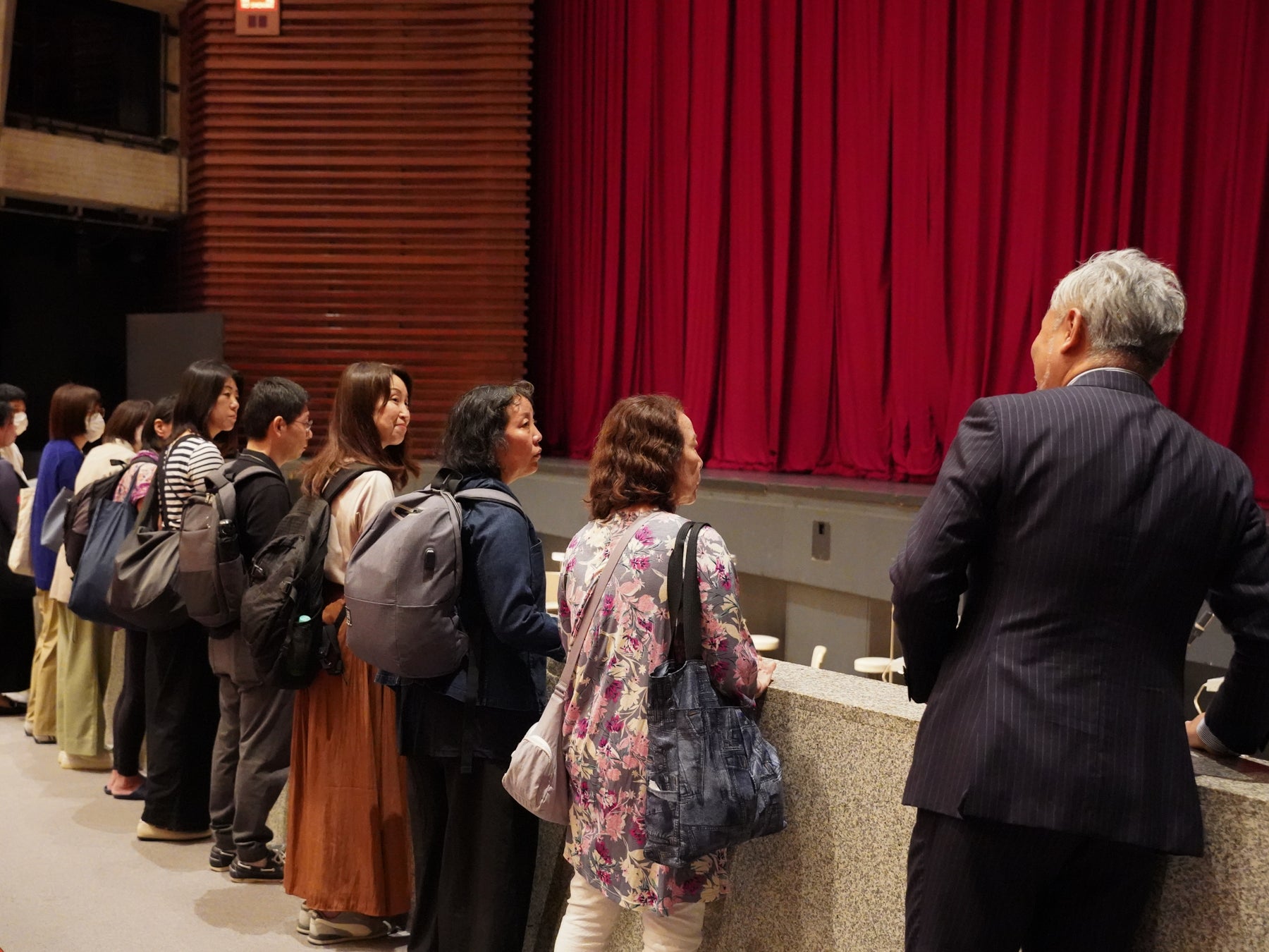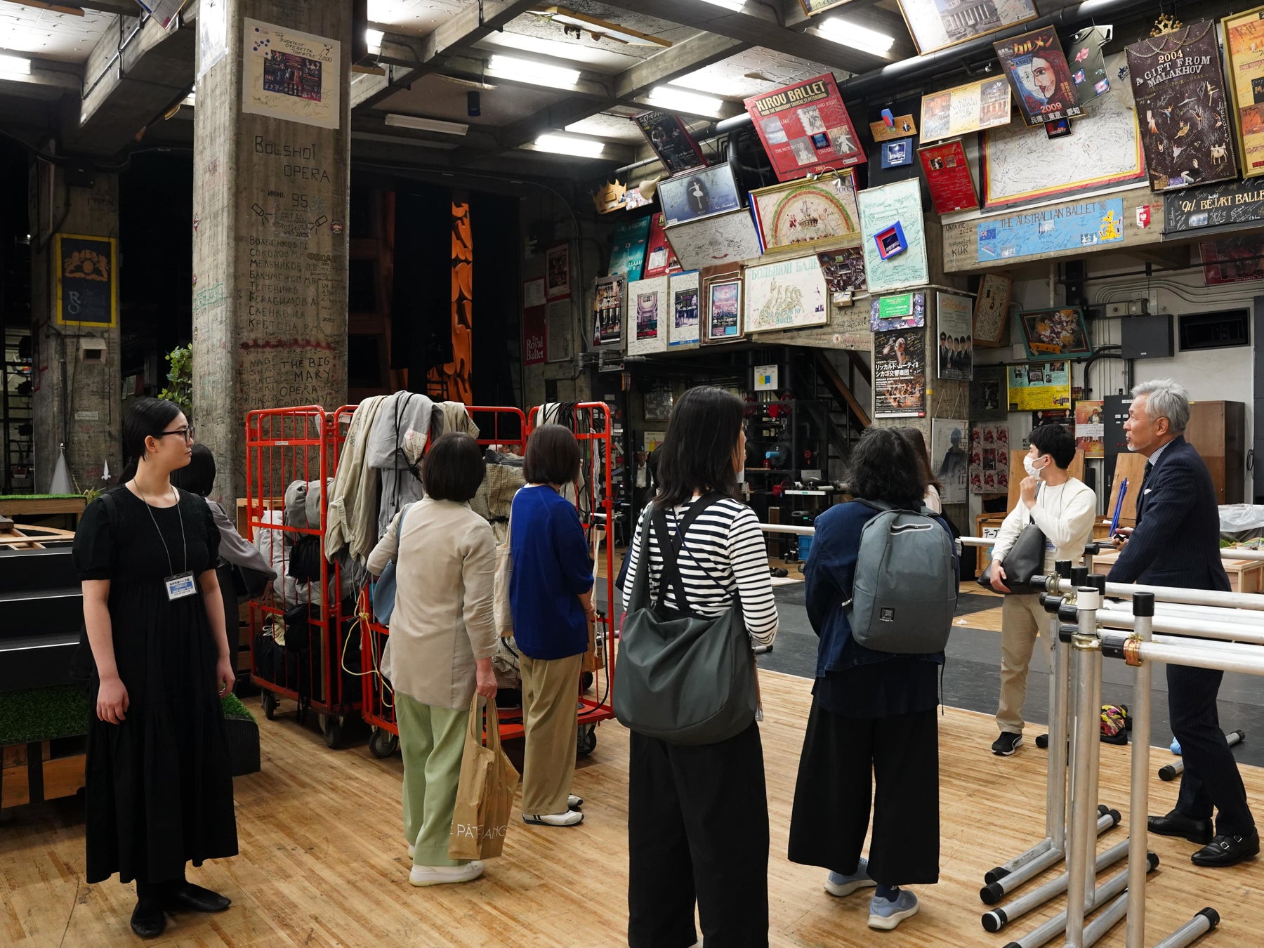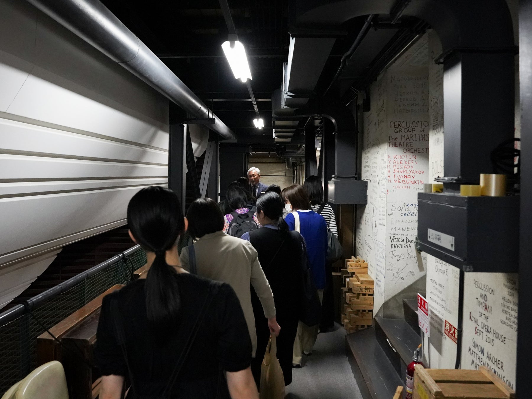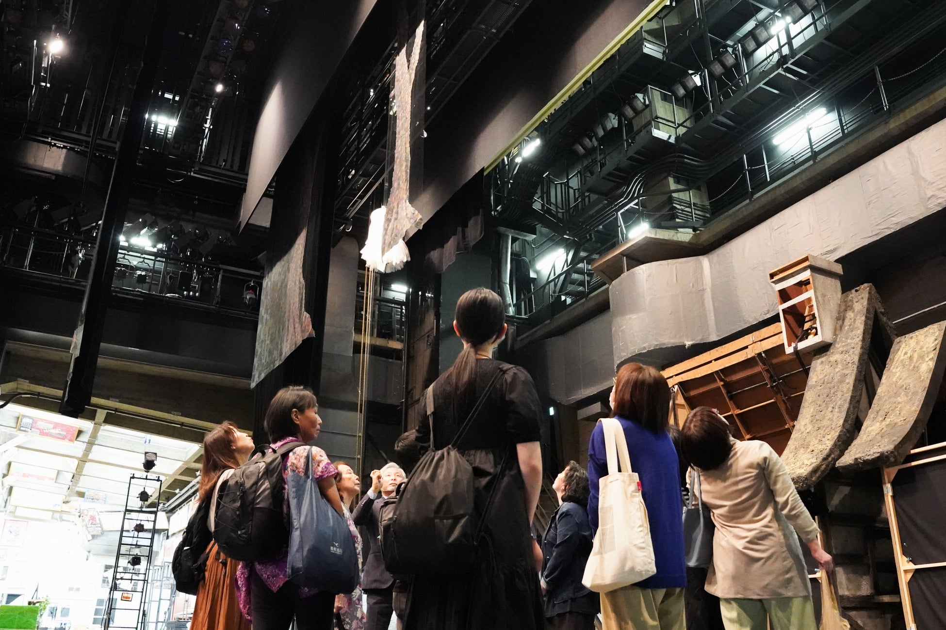 ダンサーたちが終演後の余韻を楽しむ様子を間近で感じながら、舞台のセットや、頭上にある「バトン」と呼ばれる装置などを見学。舞台から客席の景色を見渡し、普段は体験できないダンサー側の視点も体験しました。