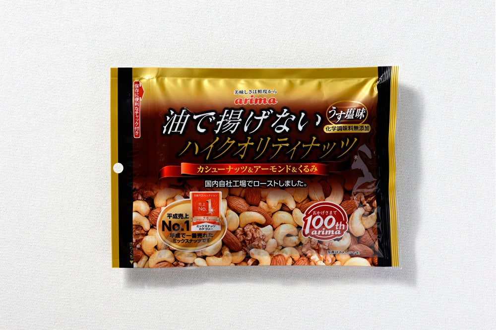 アリマの自社工場にてナッツを各種焙煎し、その後最先端のミックスナッツ専用包装機にて包装しています。「窒素充填」を行うことで、酸化を防止し長期的な品質維持を実現した、鮮度の高い新鮮なミックスナッツです。