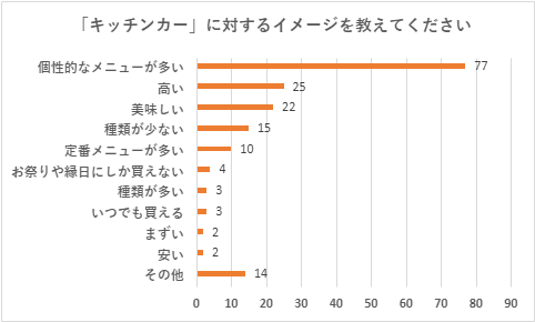 キッチンカーのイメージでは「個性的なメニューが多い」という回答が最も多く、次いで、「高い」「美味しい」と続きます。