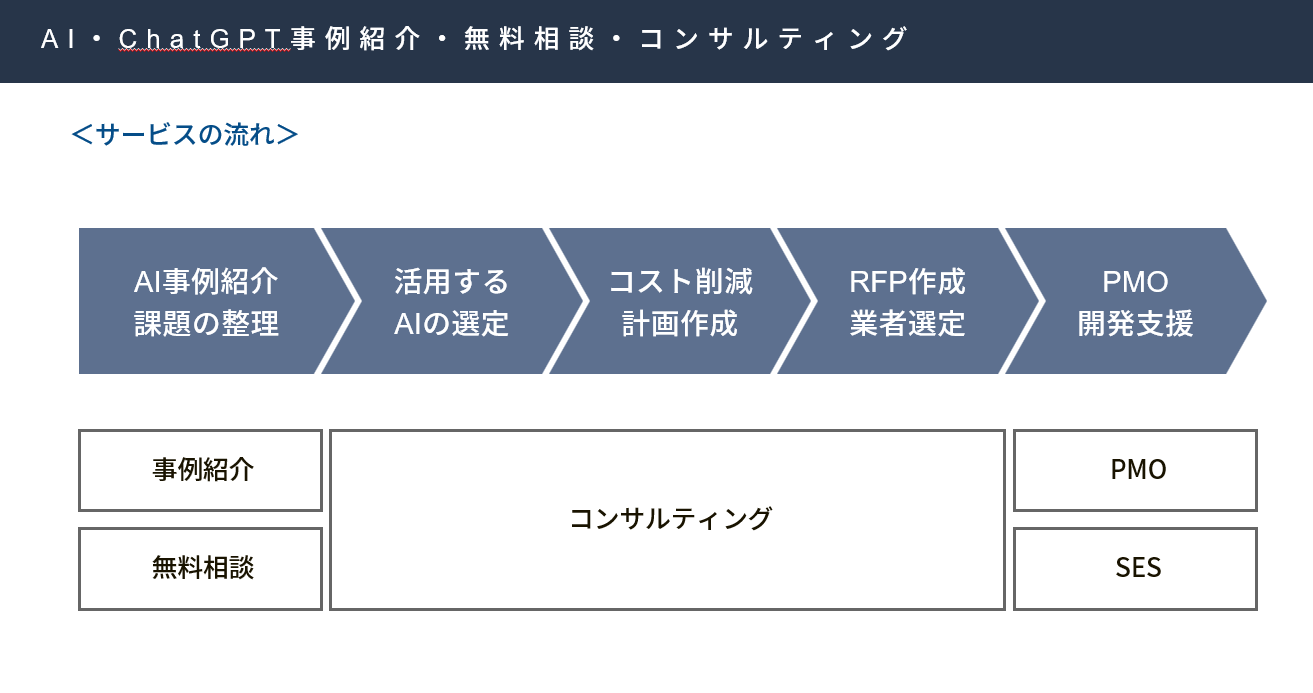 ・必要に応じてシステム開発やデータ連携のRFP作成支援、ChatGPTを活用したシステム開発のベンダ選定・技術選定もサポートします。