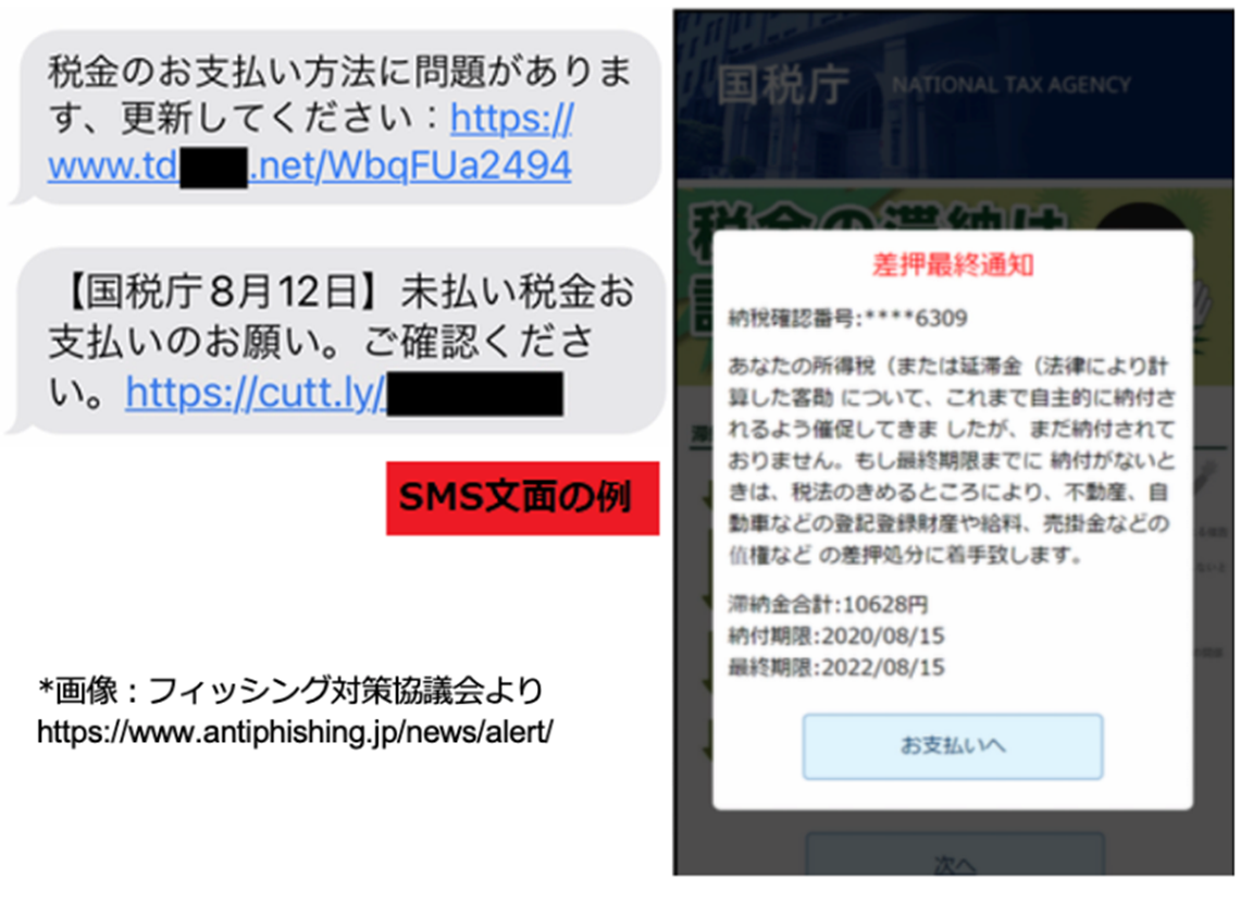 納税の時期を狙ったのか、8月に「未払い税金がある」「督促状」などとかたり、「最終期限までに納付が確認されない場合は、財産を差し押さえる」などと焦られる内容でフィッシング詐欺メールやSMS(ショートメール)が出回っていることが確認されています。