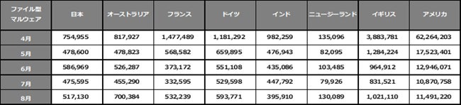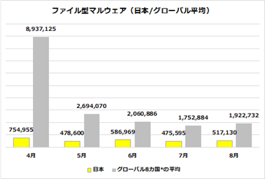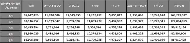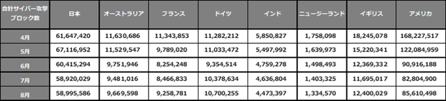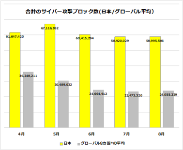 8月は日本だけではなく、グローバル全体でサイバー攻撃のブロック数が微増する傾向にありました。下記の表は、日本のブロック数と主要8カ国*1 の平均値を並べたものです。グローバルの平均値は、7月は約2,347万件でしたが、8月は約2,406万件と少し増加しました。