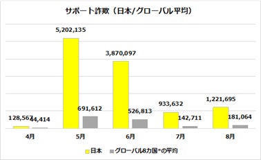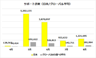 グローバルで8月にブロックされたサポート詐欺の数は微増する国はあるものの、日本と比較すると他国はブロックの桁が少なく、日本でのサポート詐欺ブロック数が依然として多い結果となりました。