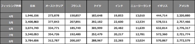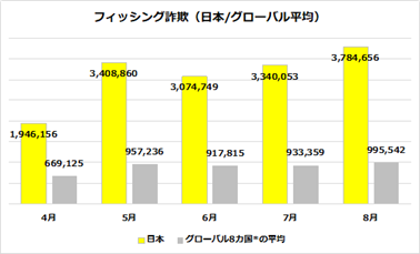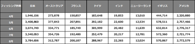 日本で8月にブロックされたフィッシング詐欺は、約378万件と7月に比べ約44万件増加しました。グローバル全体で比較しても、依然として日本が1番フィッシング詐欺のブロック数が多い結果となっています。8月は日本、フランス、ドイツ、インド、アメリカで7月と比べ増加しています。