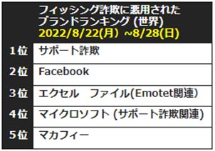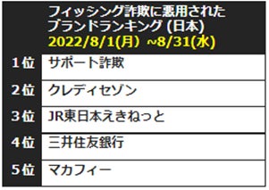 多く確認されたフィッシング詐欺TOP5(8月の1ヶ月間・日本)