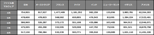 日本でブロックされた、Emotet(エモテット:メールの添付で送付されるウイルス)などを含むファイル形式で送付されるマルウェアのブロック数は、8月は約52万件でした。ブロック数は7月は約48万件だったのに対し、微増しました。グローバル全体のブロック数も7月と比べると増加し、特にオーストラリア、フランス、ドイツ、ニュージーランド、イギリスを中心に6-7月に比べ増加しました。