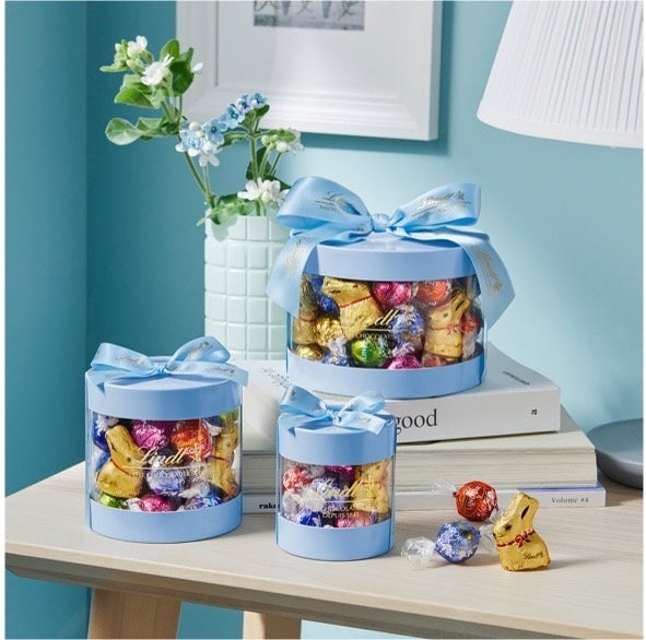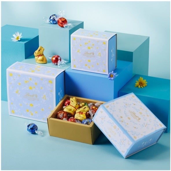 上品なパステルブルーの立体的なリボンが目を惹くギフトボックスは、5つのサイズでご用意しています。見た目もかわいらしいので、ギフトとしても大人数でのシェアとしてもぴったりです。期間限定の「ミニゴールドバニー」や、リンツの定番であるリンドールが楽しめるギフトボックスです。