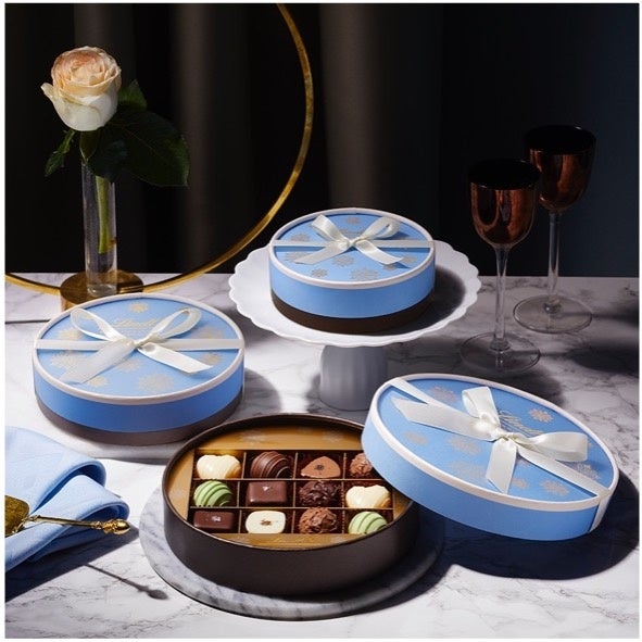 リンツこだわりのチョコレートが楽しめるメートル・ショコラティエセレクションはとっておきのギフトにおすすめ。パッケージのブルーとホワイトのリボンのコントラストが美しい限定パッケージの中には、大人な味わいの限定フレーバー「ダーク キャラメルシーソルト」のほか、上品な味わいのプラリネがアソートされています。