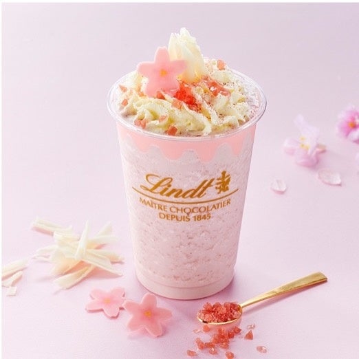 「さくらキャラメリゼ ショコラドリンク」は、リンツのホワイトチョコレートドリンクに2種類のチェリーをブレンドすることで、深みのある味わいに仕上げたドリンクを使用。トップには、まるでさくらが舞い散っているようなさくら色のキャラメリゼや、つややかな透明感のあるさくらソースをトッピングした、一口で満開のさくらを味わえる春限定のショコラドリンクです。