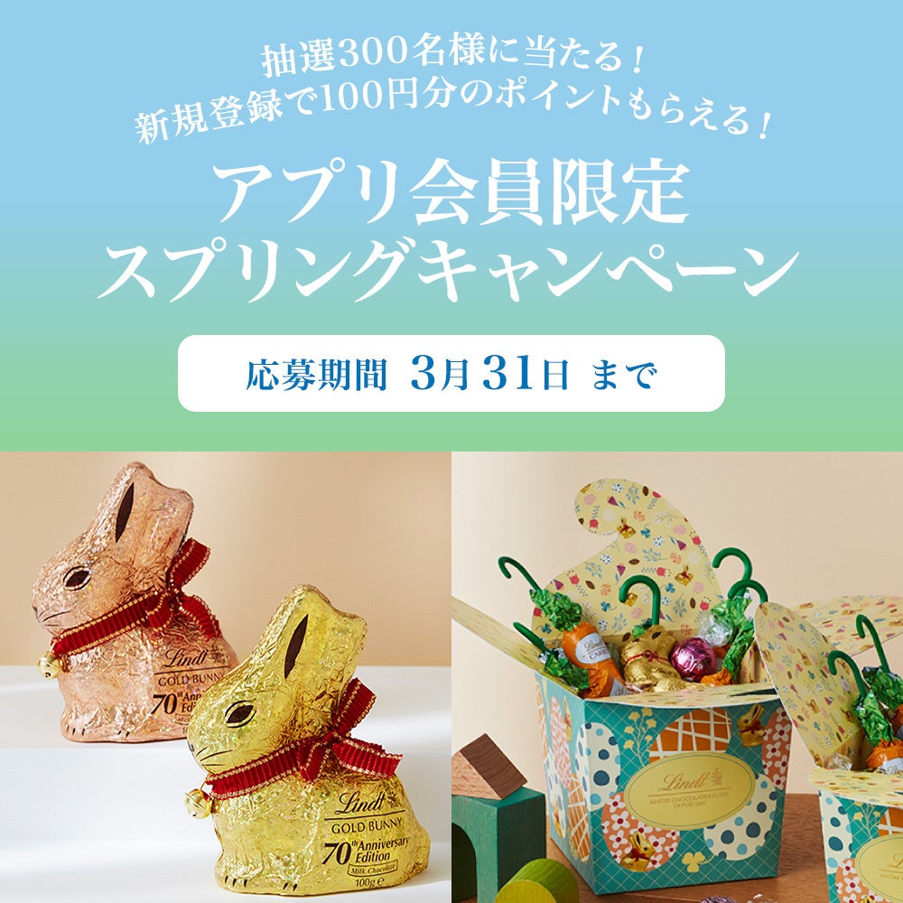 リンツ公式アプリをダウンロードのうえ、会員登録をしていただいている⽅の中から抽選で300名様へ「リンツ ゴールドバニー」をはじめとしたイースター限定のチョコレートなどをプレゼント。加えて、期間中に新規会員登録いただいた⽅にはもれなく、100円分のポイントをプレゼントいたします。