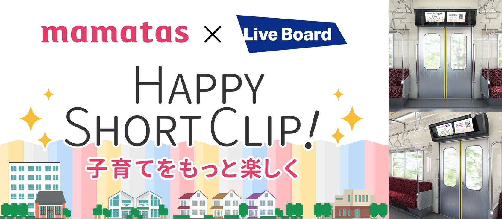 C Channel株式会社(本社:東京都目黒区、代表取締役社長:森川 亮)が運営するママパパ向け動画メディア「mamatas(以下、ママタス)」(総フォロワー数110万以上・https://www.mamatas.net/ )、株式会社 LIVE BOARD(本社:東京都渋谷区、代表取締役社長 櫻井 順、以下LIVE BOARD)は、共同でLIVE BOARDが所有する埼玉高速鉄道・ダイナミックビークルスクリーン全480面を活用し、ママタスによる育児をがんばっているママパパ向けのリアルなお役立ち情報コンテンツ『HAPPY SHORT CLIP!子育てをもっと楽しく』の放映を実施します。