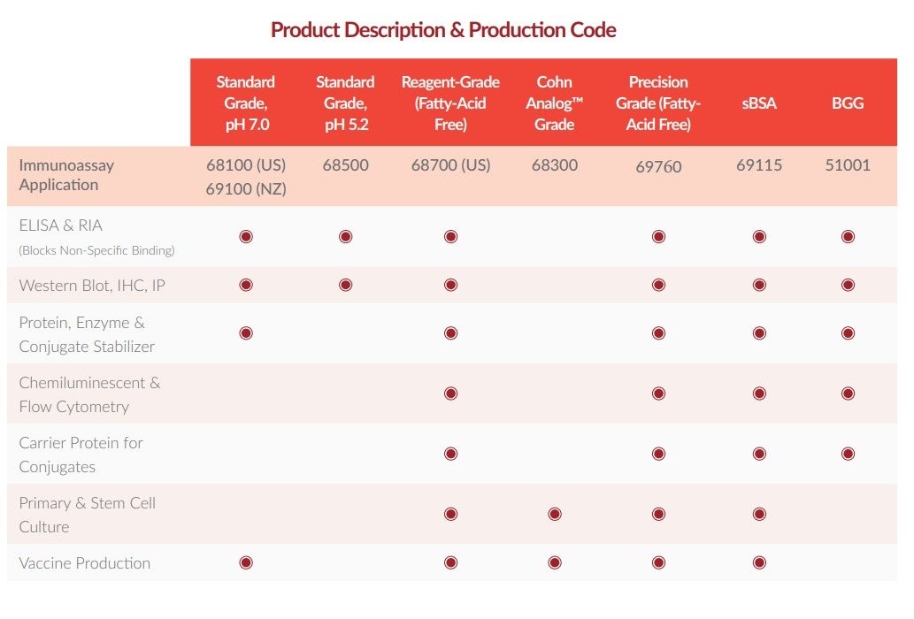 RIA, EIA, その他イムノアッセイだけではなく、キャリブレーター、酵素安定化剤などでも使用可能です。