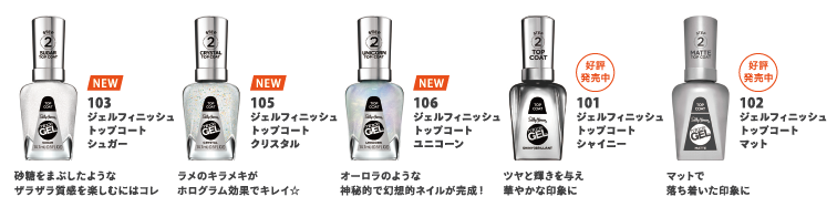 ジェルフィニッシュ トップコート シャイニーとジェルフィニッシュ トップコート マットに新たに加わる3種のトップコートは、お好きなジェルフィニッシュ ネイルカラーの上に重ねることで、新しい色や質感を楽しみながら、ロングラスティングを可能にしてくれます。