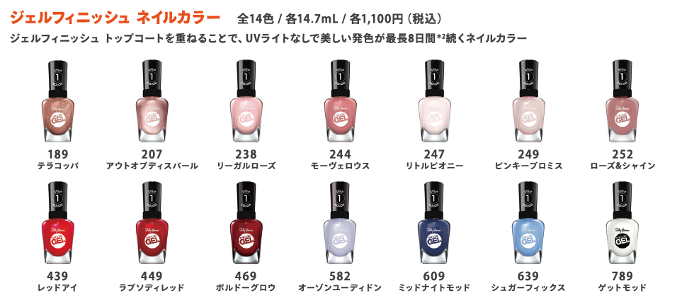 *1 Source: Nielsen IQ 2021 *2 サリーハンセン調べ/ジェルフィニッシュ トップコートを使用した場合。実際の期間は爪の状態やライフスタイルに左右されます。