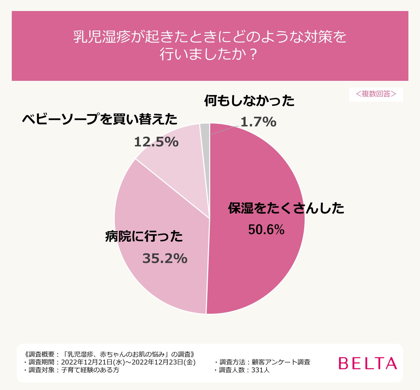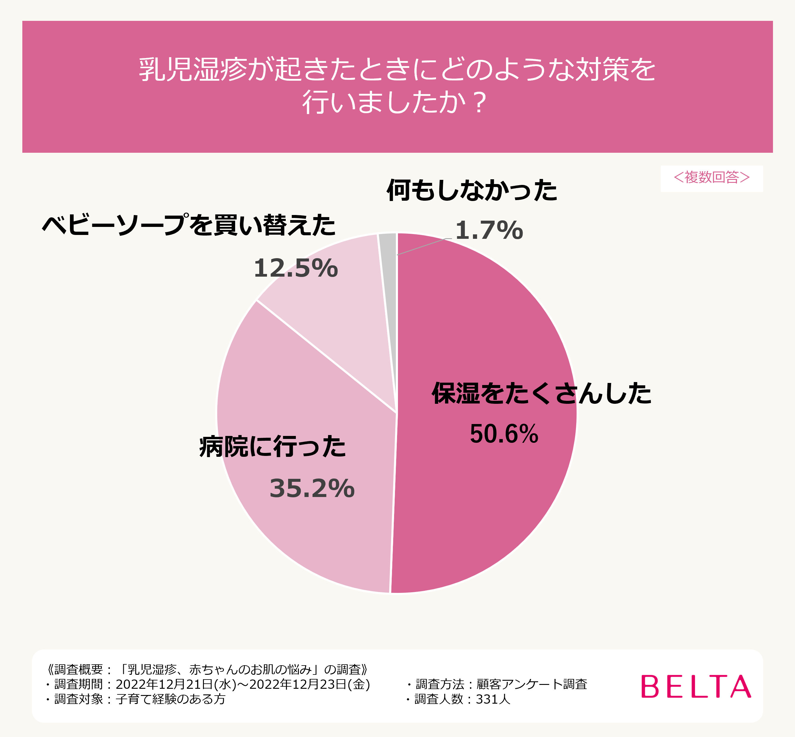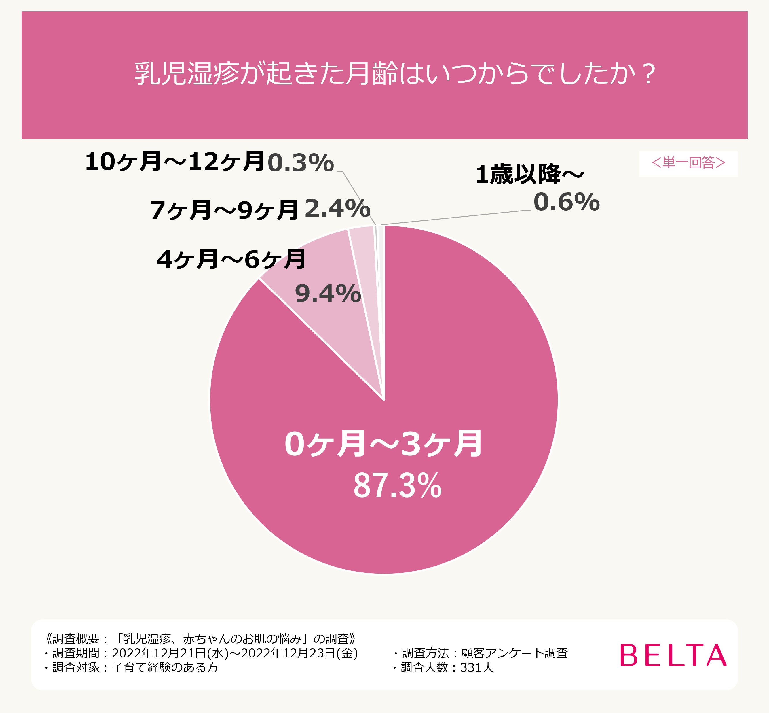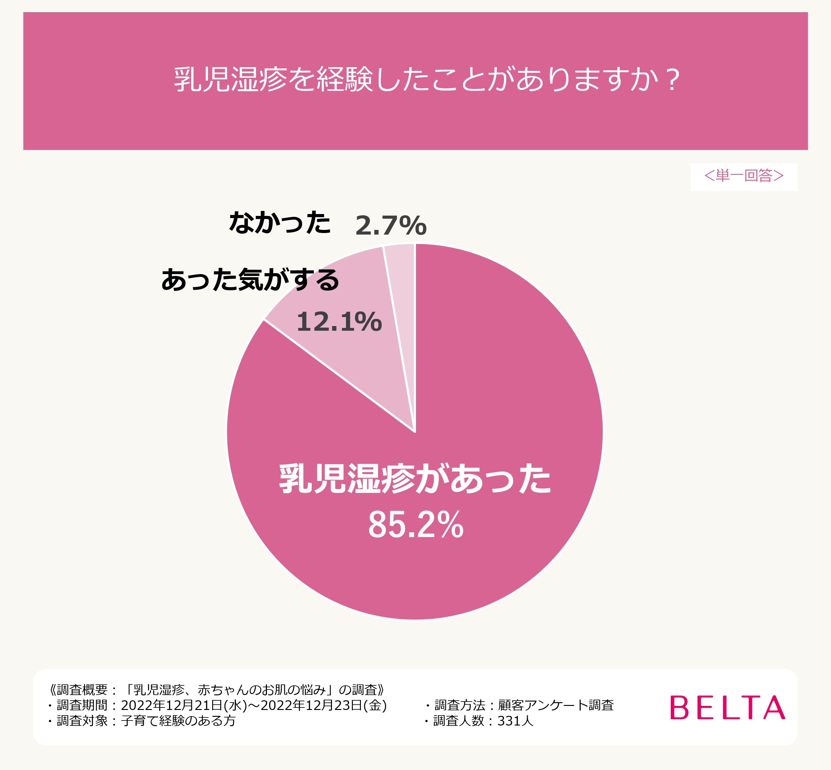 株式会社ベルタ(本社所在地:東京都港区、代表取締役:武川 克己)の運営する女性ライフステージブランドBELTAは、子育て経験のある331人を対象に、「乳児湿疹、赤ちゃんの肌の悩み」に関する調査を実施いたしました。