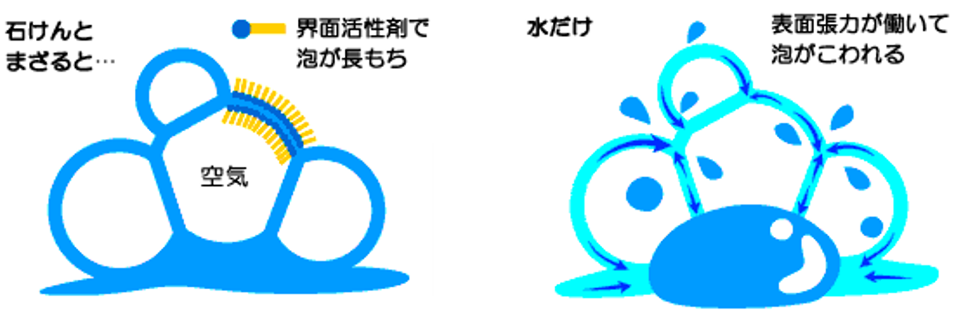 水だけをふると泡はたちますが、すぐ消えます。石鹸や洗剤を溶かすと、泡立ちが良くなり、なかなか消えない泡に。 これは、界面活性剤が水の表面張力を弱くしていることと、泡の膜に界面活性剤が並んで膜を強くしているからです(※2)。