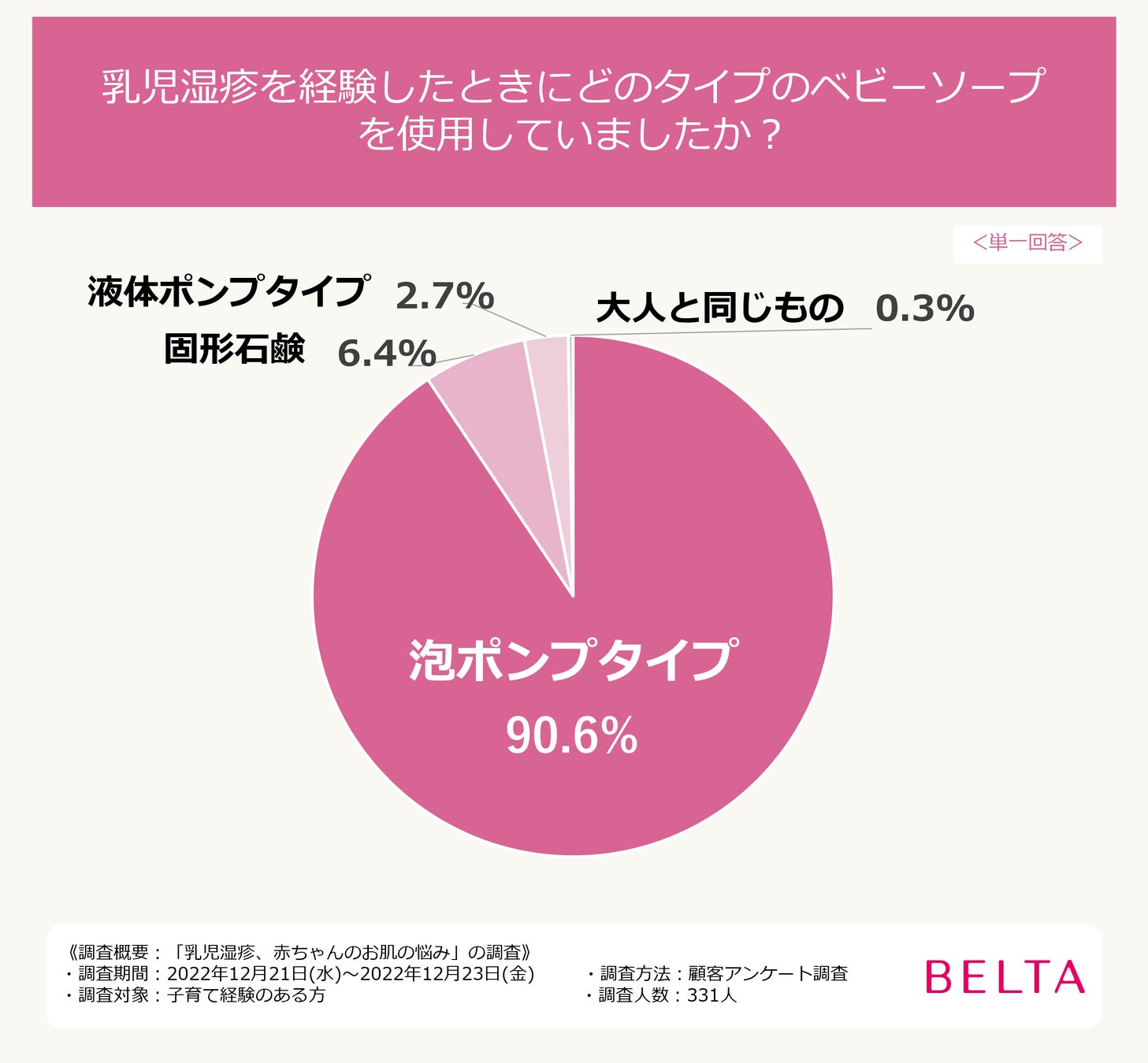 - 9割以上の人が乳児湿疹を発症したときに泡ポンプタイプのベビーソープを使用