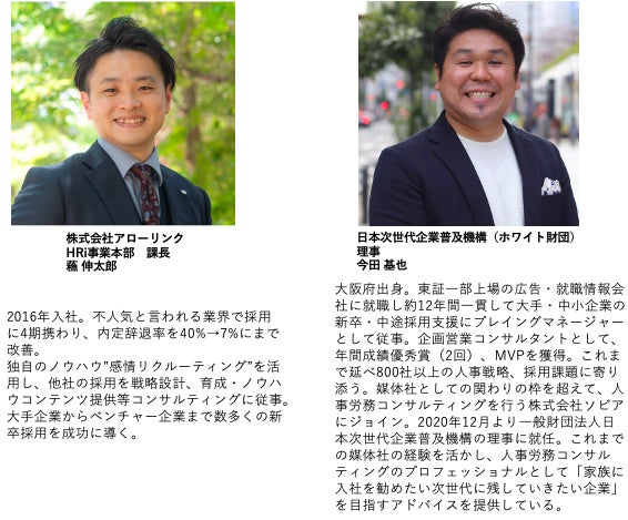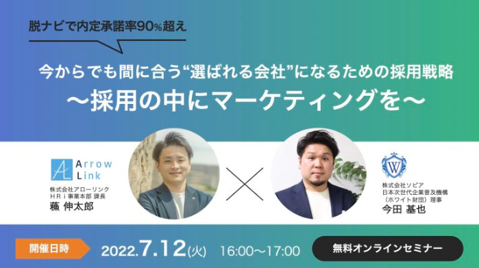 株式会社アローリンク(本社:兵庫県神戸市中央区、代表取締役:蓬莱和真)と、株式会社ソビア(本社:大阪市北区、代表者:岩元翔)は、7/12(火)に無料オンラインセミナーを開催いたします。「“選ばれる会社”になるための採用戦略」と題し、90%以上を内定承諾に導く採用ノウハウなどをお伝えします。