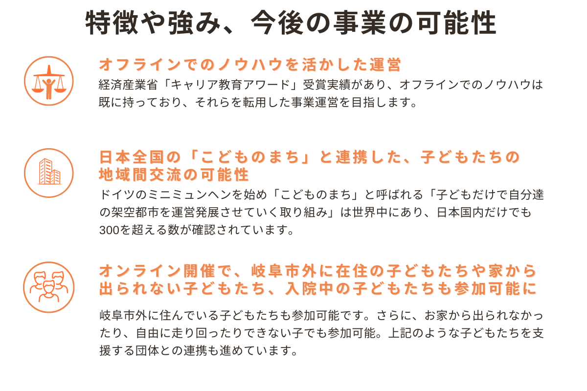 ぎふマーブルタウンのオンライン版として「こどものまちオンライン」を開発したいと考えている。現在、バーチャル展示会などを手がけてきた企業と連携して企画中。