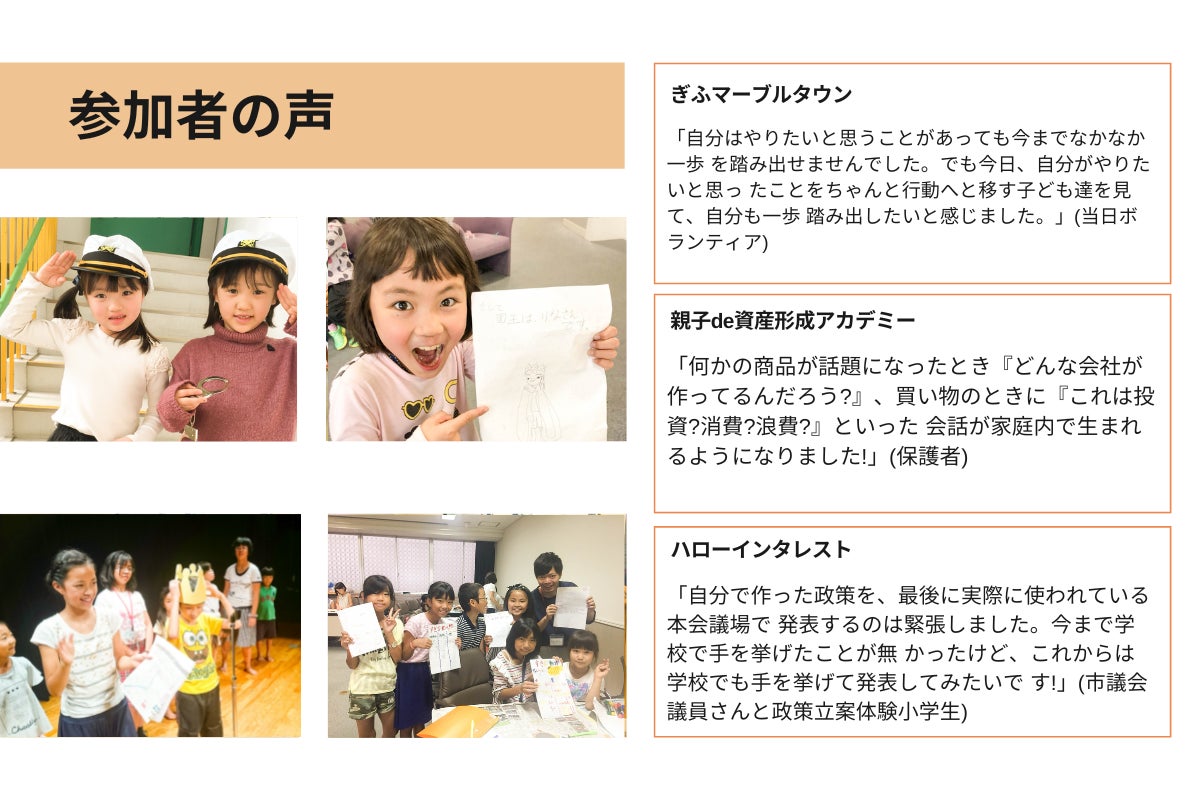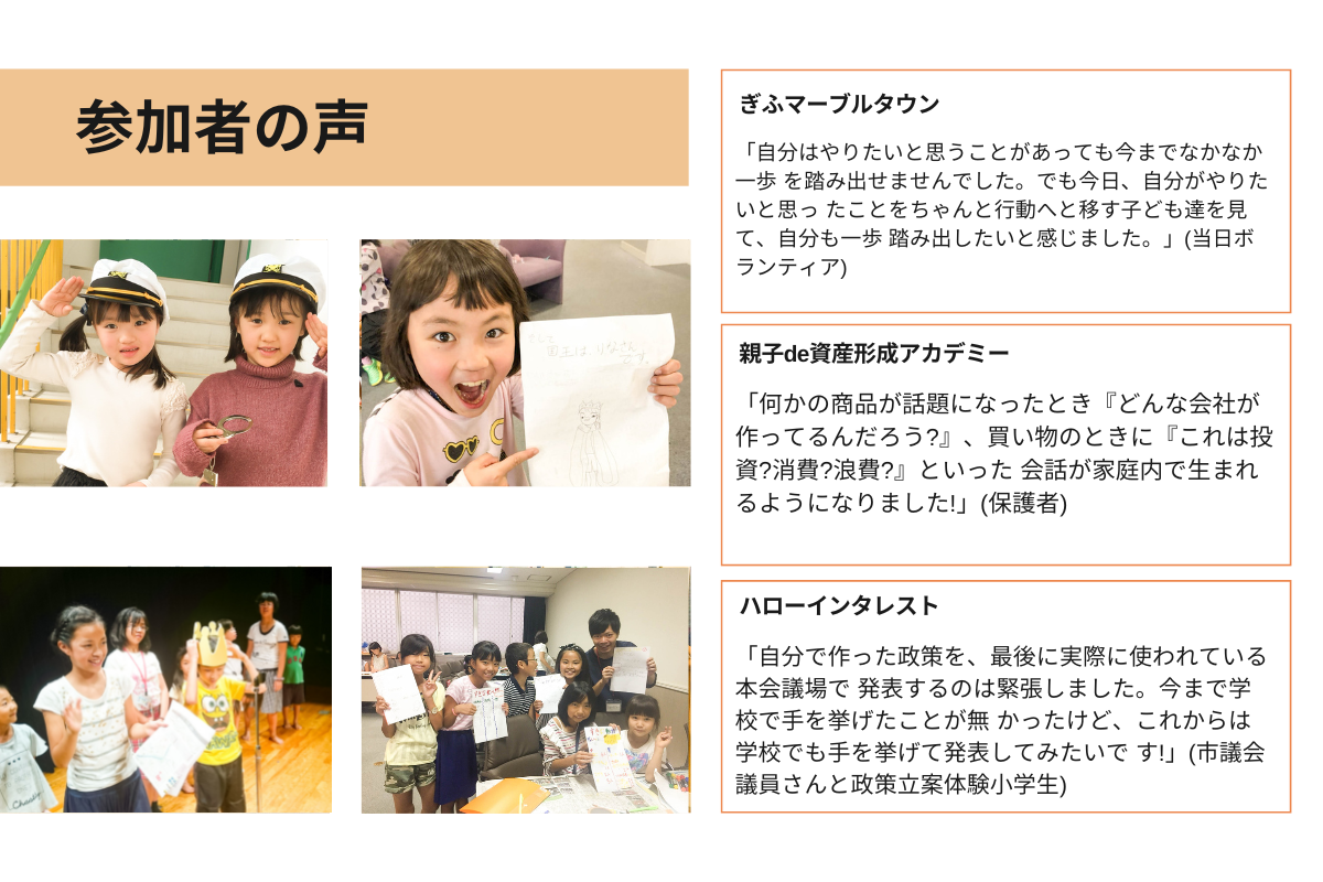 ぎふマーブルタウン:失敗と挑戦が許容された仮想都市の運営・発展を通して主体性・協調性・創造性を育む。年2,3回の開催でのべ5,152名の小学生が参加。特に多い回では1日791名の小学生と100名を超えるボランティアが参加。