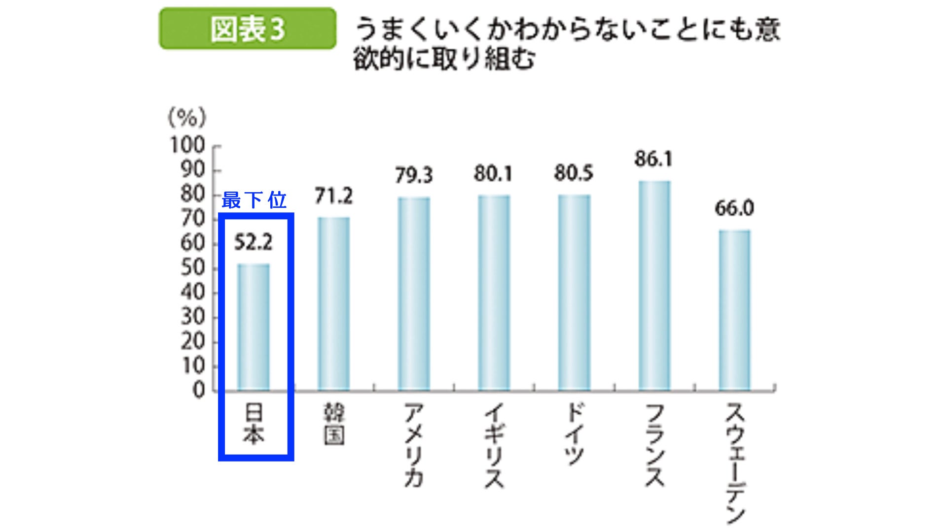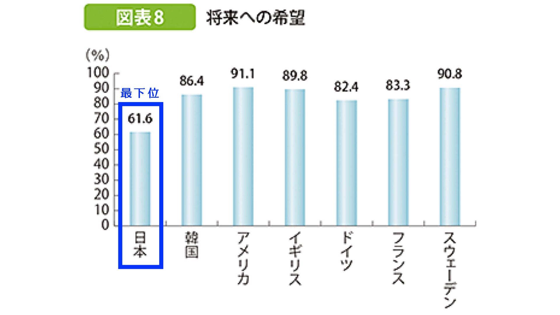 内閣府「平成26年版 子ども・若者白書」によると日本の子ども・若者は諸外国と比べてもっとも将来に希望を持てず、失敗を恐れて挑戦できないと考えていることが調査結果として示されている。