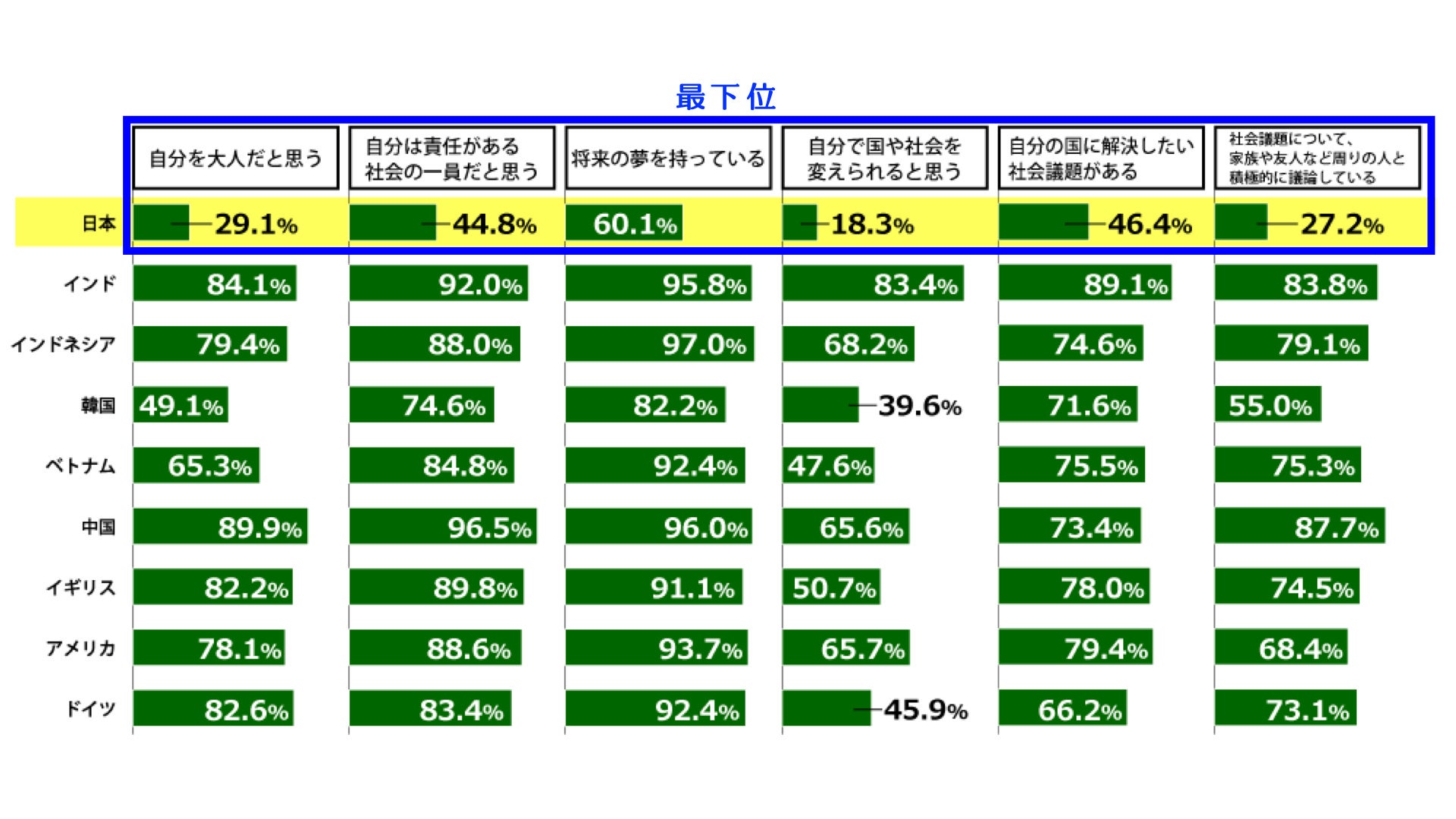 そして日本財団の「18歳意識調査」でも、日本は「自分で国や社会を変えられる」ともっとも思えていないという調査結果が出ている。