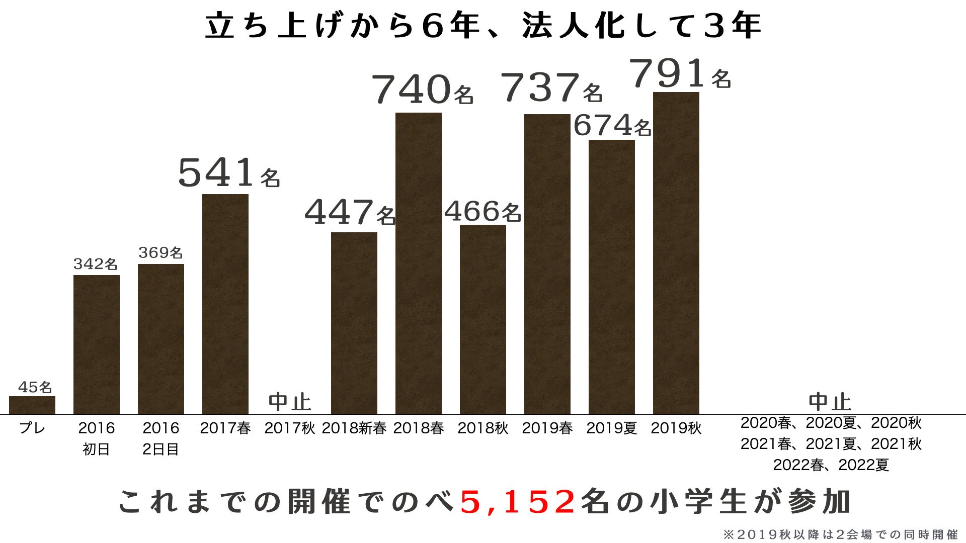 2016年〜2019年の各年2,3回の開催で、のべ5,152名の小学生が参加。特に多い回では1日791名の小学生と100名を超えるボランティアが参加。