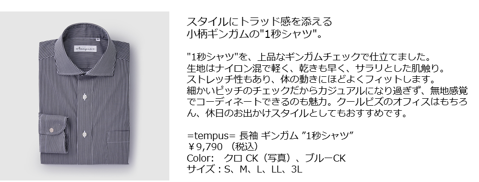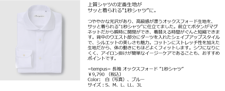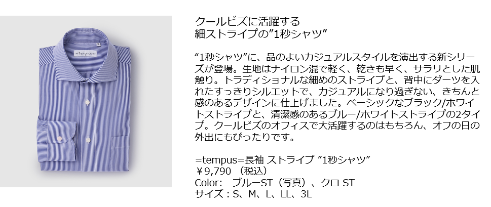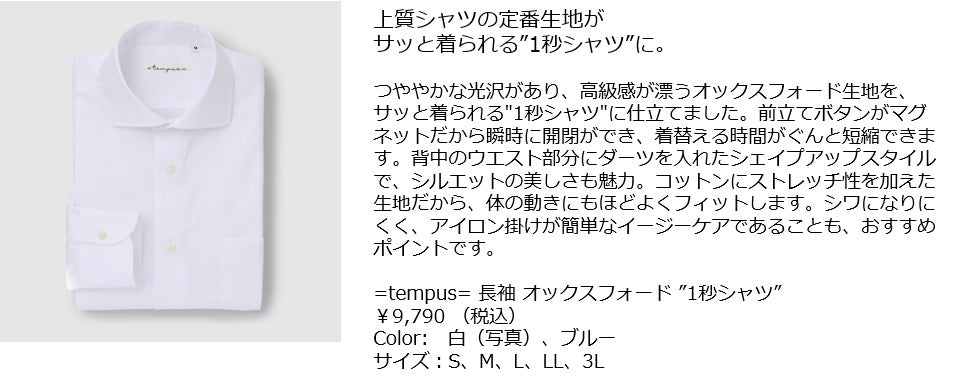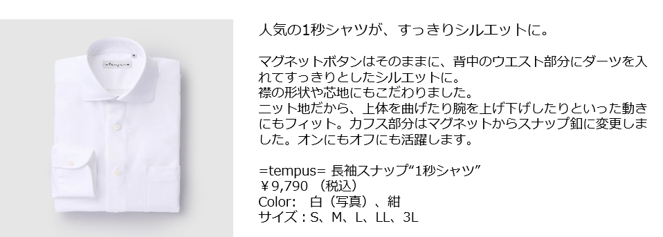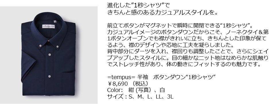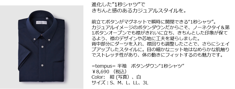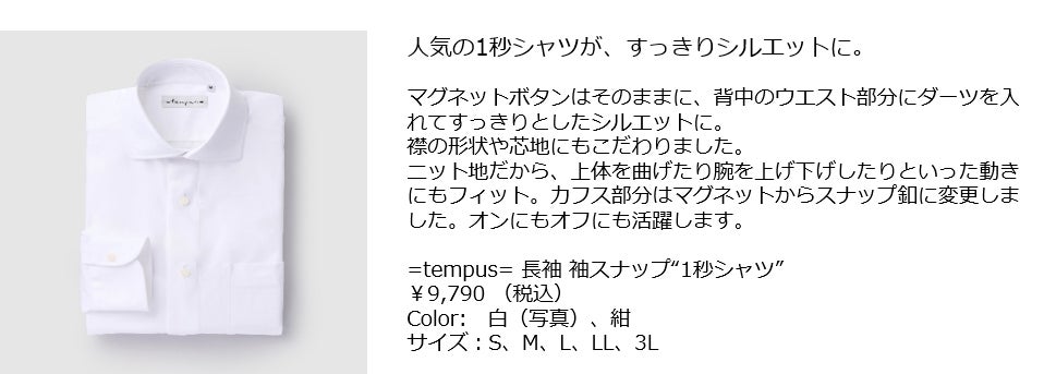 1秒でボタンが留まる!と大好評の究極の時短シャツ『=tempus= イコールテンプス』から新商品・新色の登場。